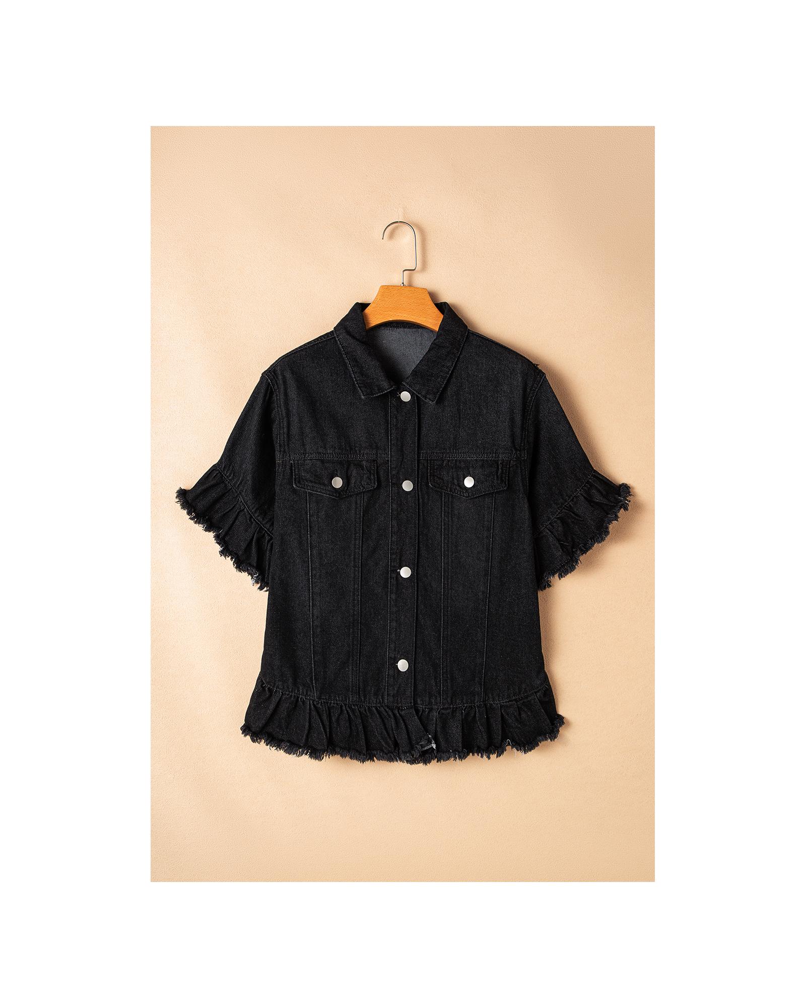 - Stylish black denim jacket with ruffled short sleeves and raw edge detail