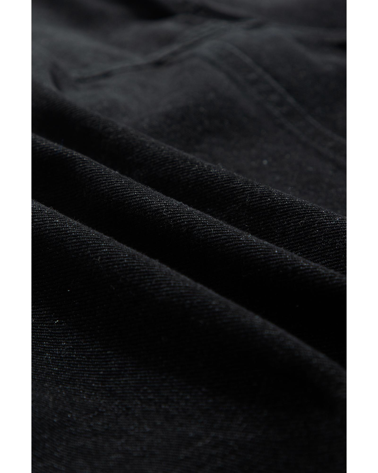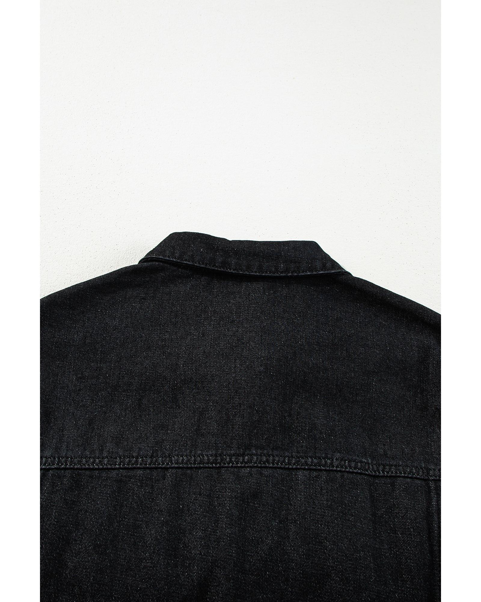 This black denim jacket features a trendy fitted design with stylish ruffled short sleeves and raw edge details. Made from durable denim fabric, it offers long-lasting wear and versatile styling options for casual outfits.