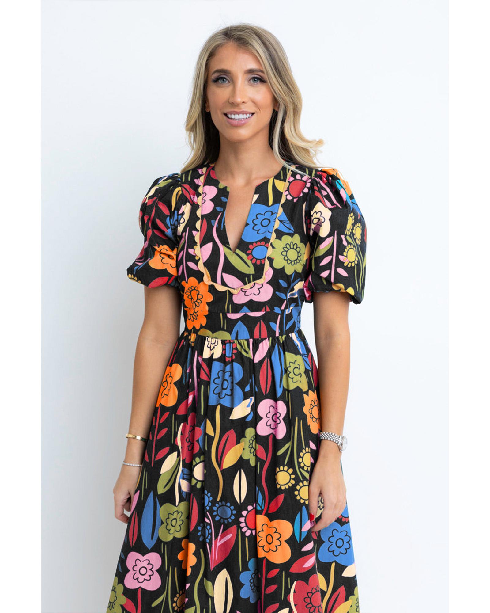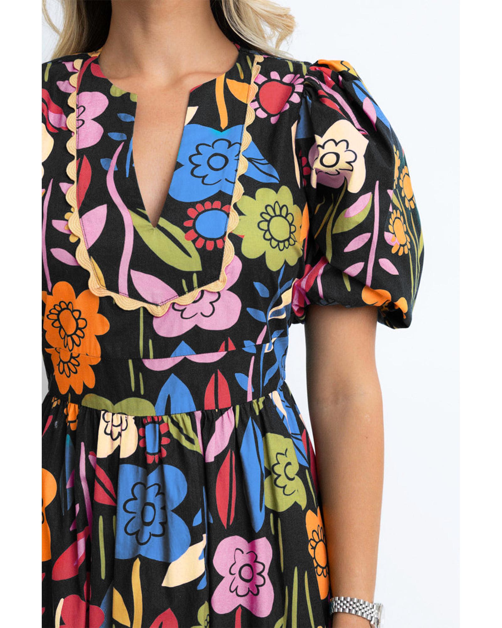This black maxi dress features a retro floral print and a stylish split neck design, creating an elegant and charming silhouette. The short puff sleeves add a playful touch, while the loose fit ensures comfort and ease of movement. Perfect for various social occasions, this dress combines vintage-inspired style with modern comfort.
