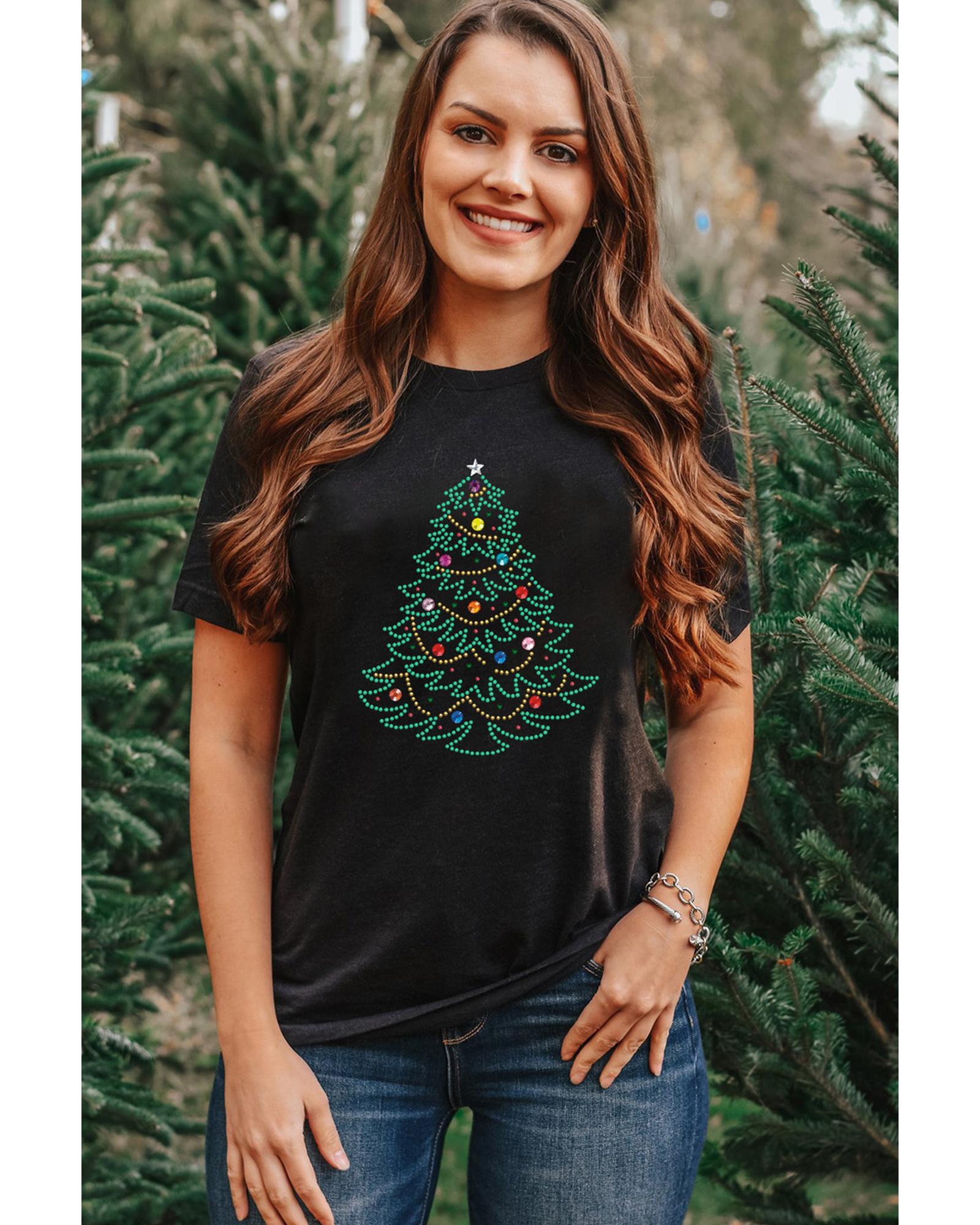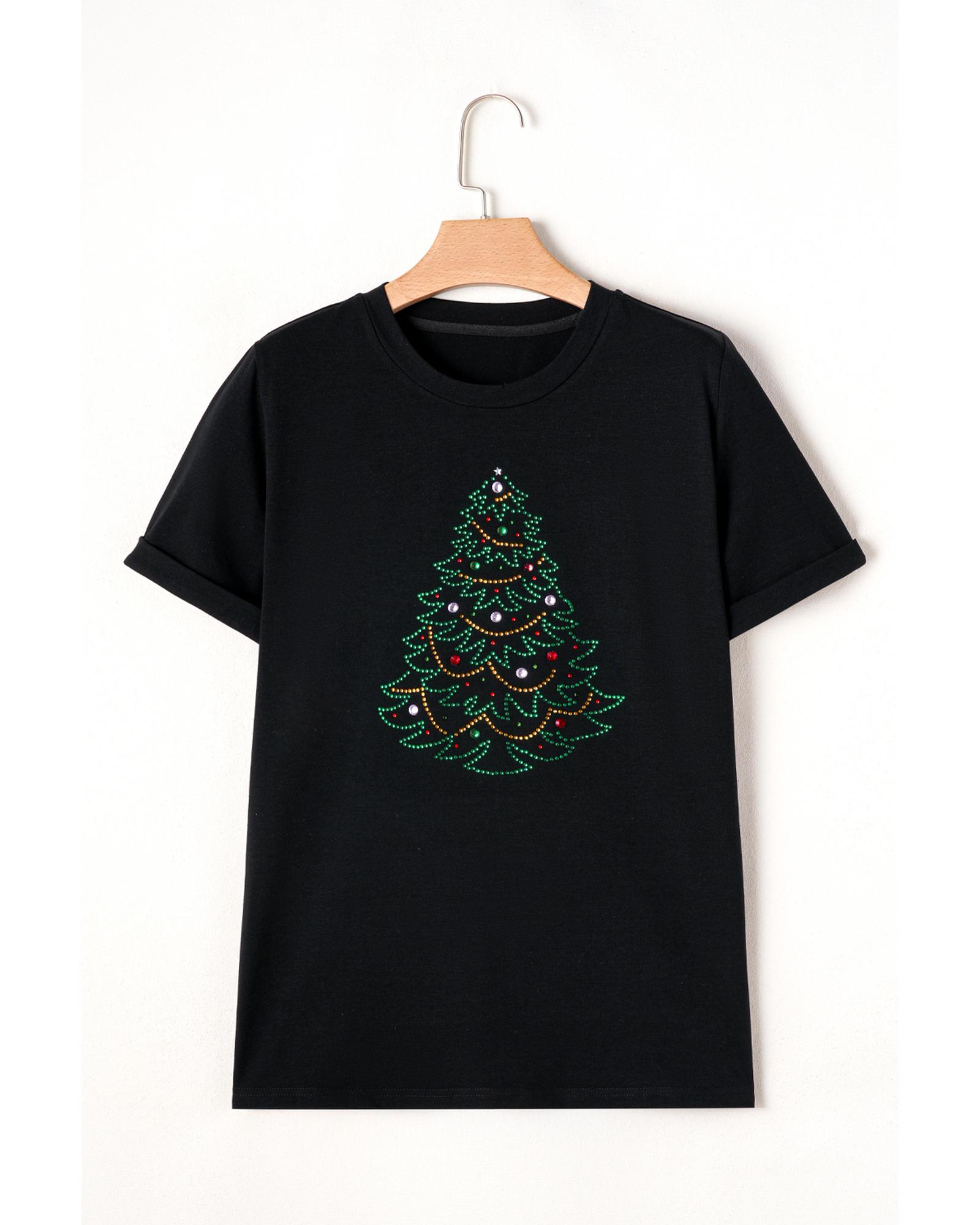 This stylish graphic tee features a festive Christmas tree design fully adorned with rhinestones, making it a perfect choice for holiday celebrations. Crafted from a soft cotton blend, it offers a lightweight and comfortable fit suitable for various casual occasions. The versatile design pairs well with jeans, shorts, or skirts, providing a trendy and festive look.