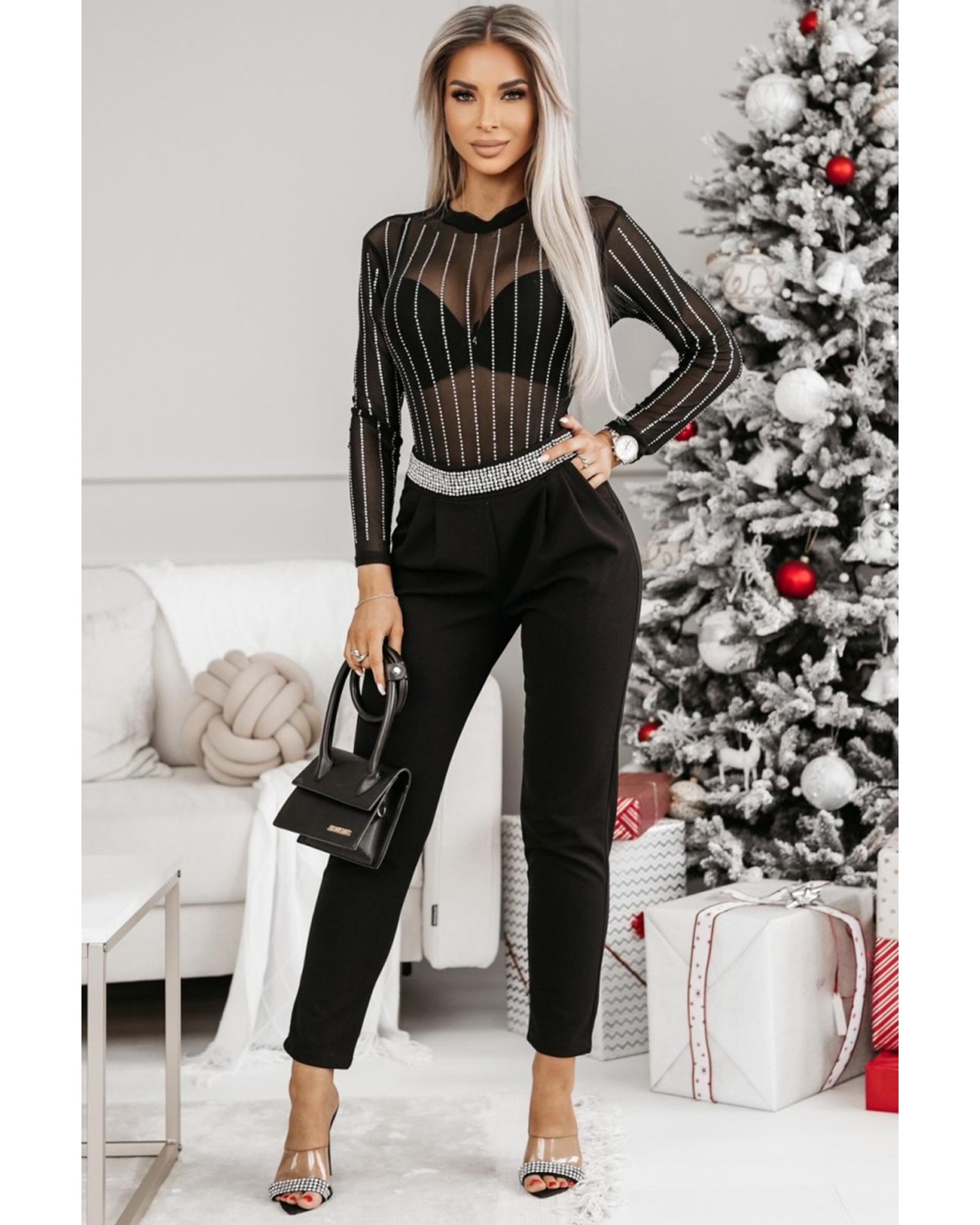 This long sleeve bodysuit features a stylish striped mesh design enhanced with sparkling rhinestone embellishments. Its sheer fabric creates a sexy and alluring look, making it suitable for both daytime and evening occasions. The fitted silhouette offers a flattering and fashionable appearance, perfect for various outfits and settings.