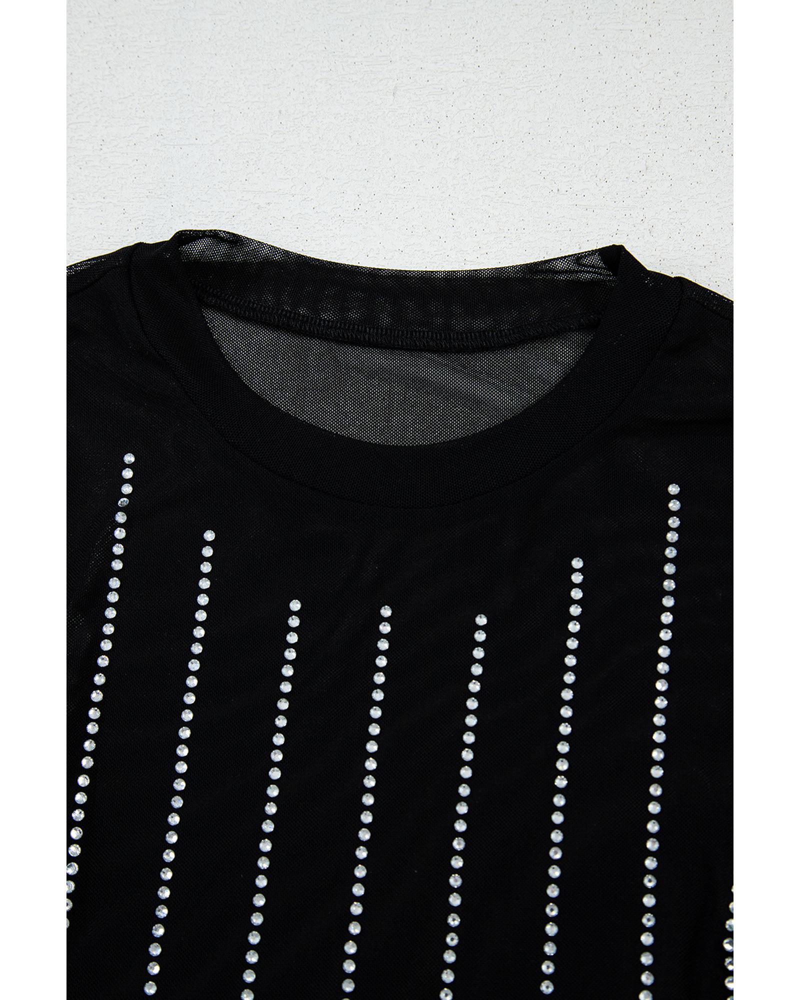 - Features include rhinestone striped details, sheer mesh fabric, and long sleeves for a flattering fit