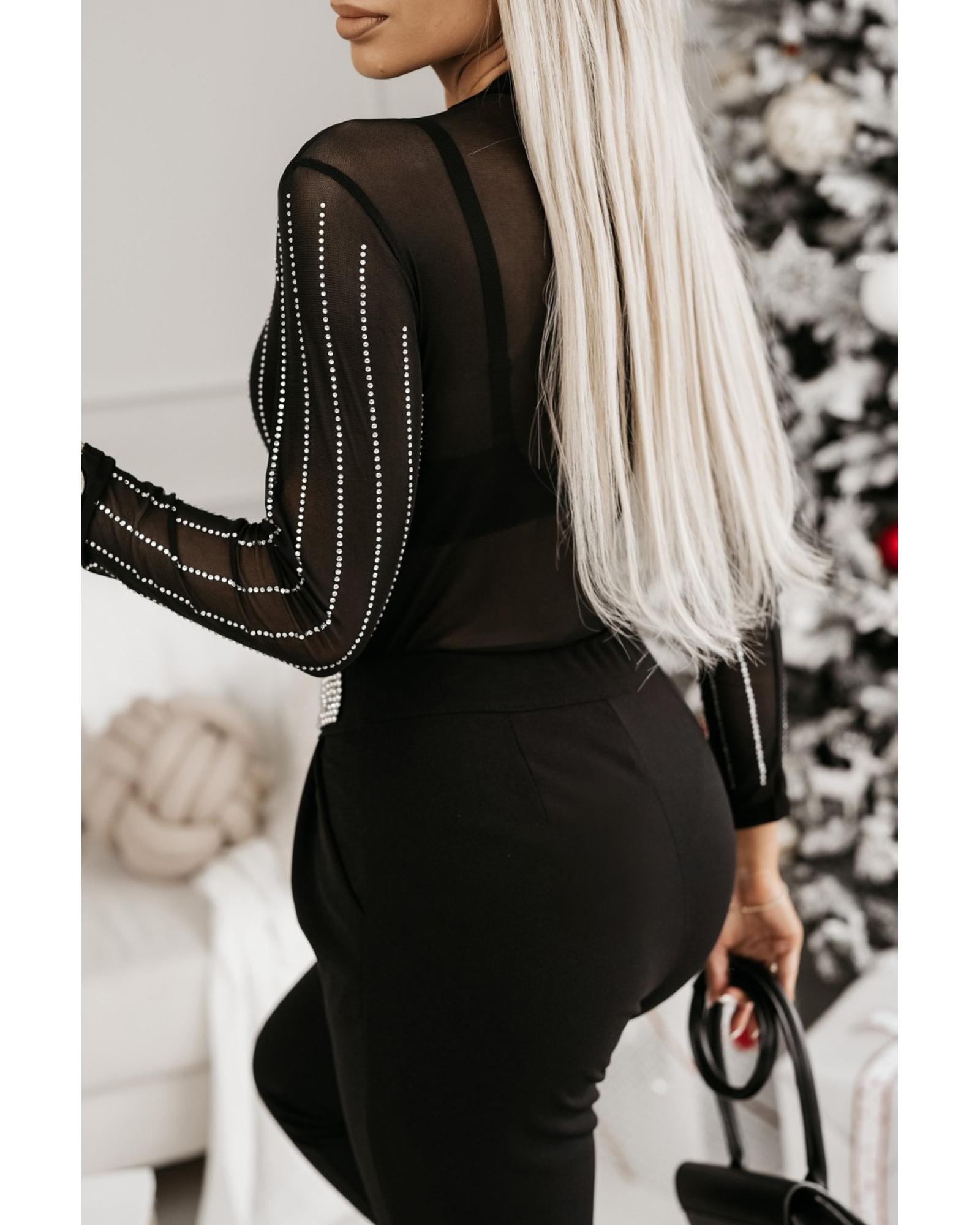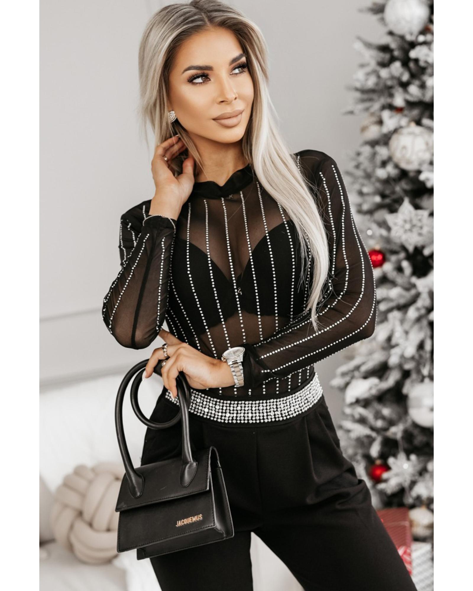 This long sleeve bodysuit features a stylish striped mesh design enhanced with sparkling rhinestone embellishments. Its sheer fabric creates a sexy and alluring look, making it suitable for both daytime and evening occasions. The fitted silhouette offers a flattering and fashionable appearance, perfect for various outfits and settings.