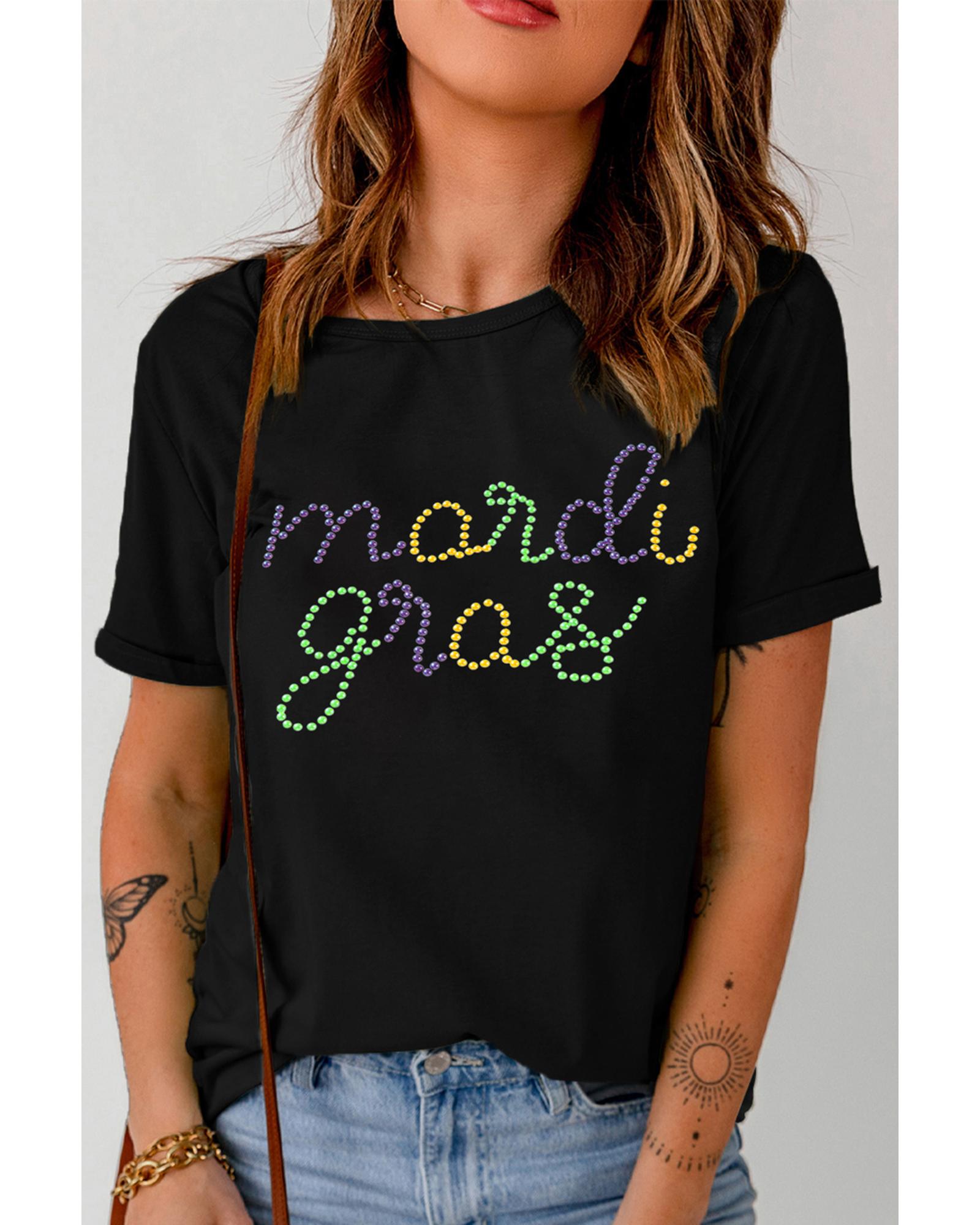 Black Rhinestone Mardi Gras Letter Graphic T Shirt – M