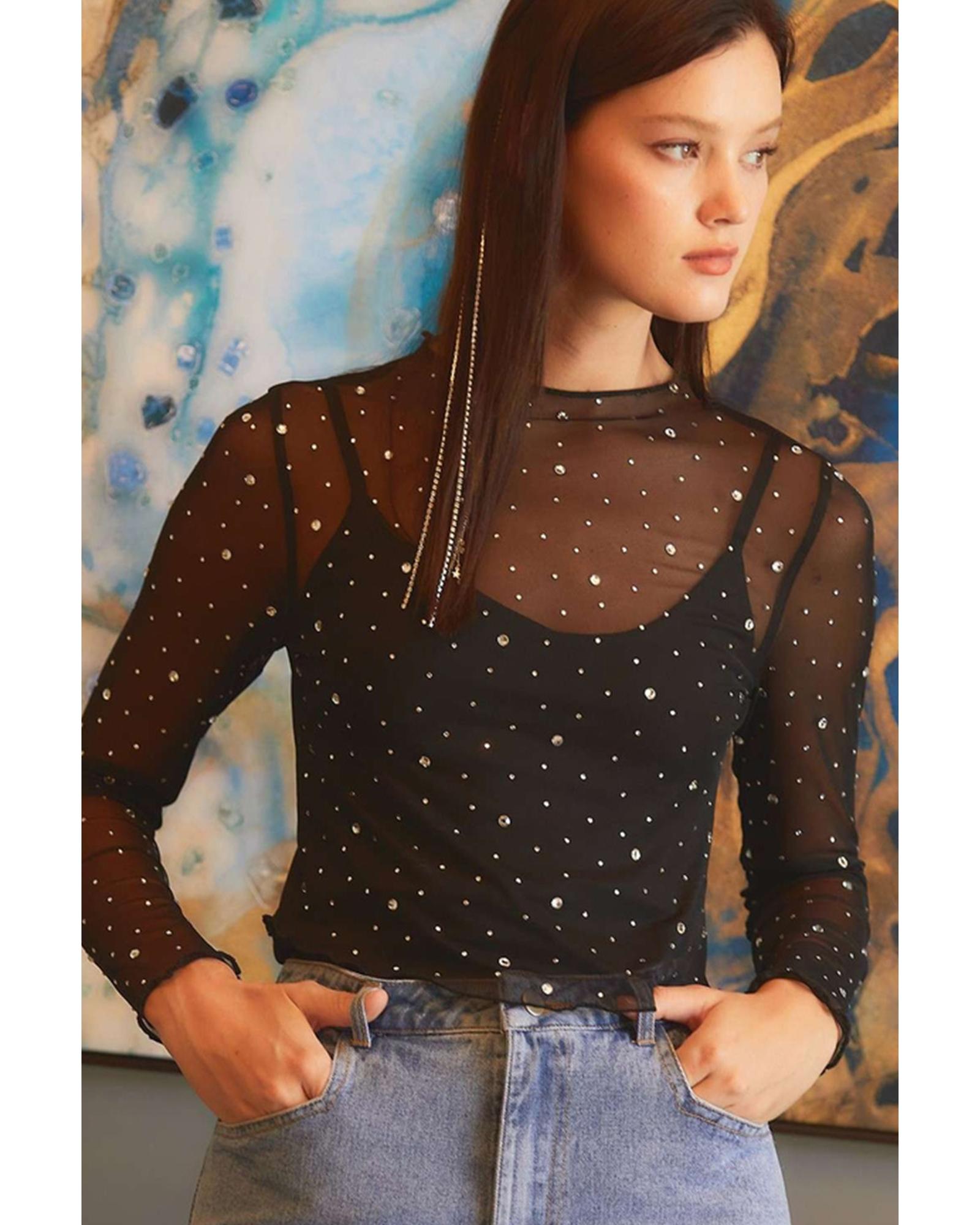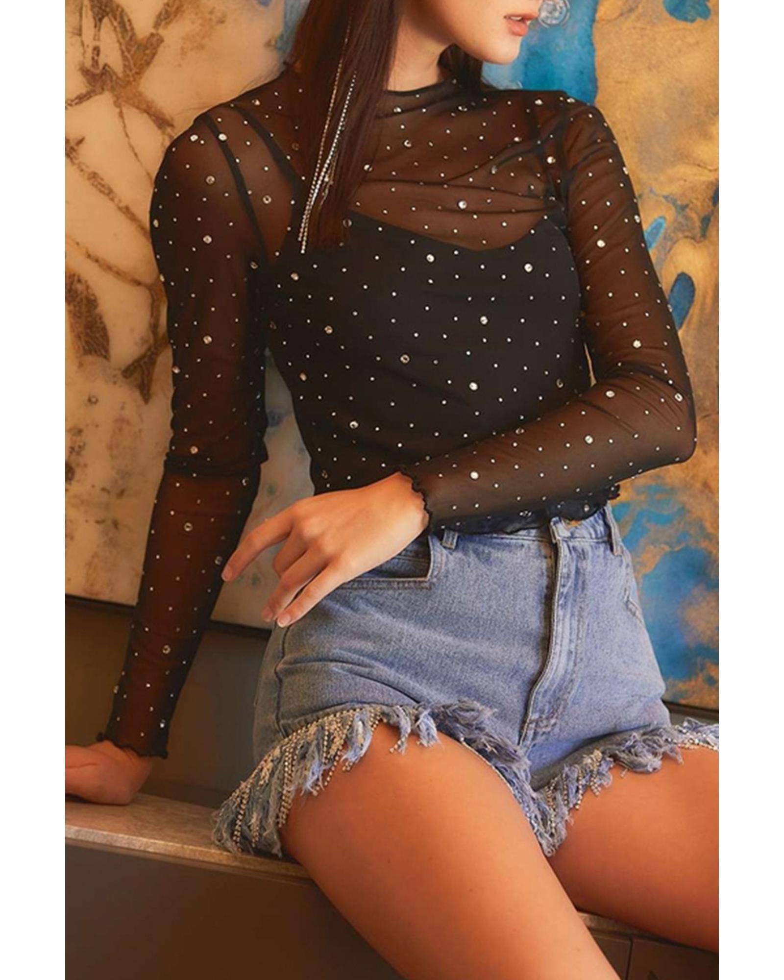 This long sleeve top features a slim fit design with a sheer mesh fabric and sparkling rhinestone embellishments, creating a stylish and eye-catching look. It is suitable for cooler weather and offers a trendy, fitted silhouette that complements various outfits. The top is designed to follow international sizing standards, with recommendations to choose one size larger for the best fit.