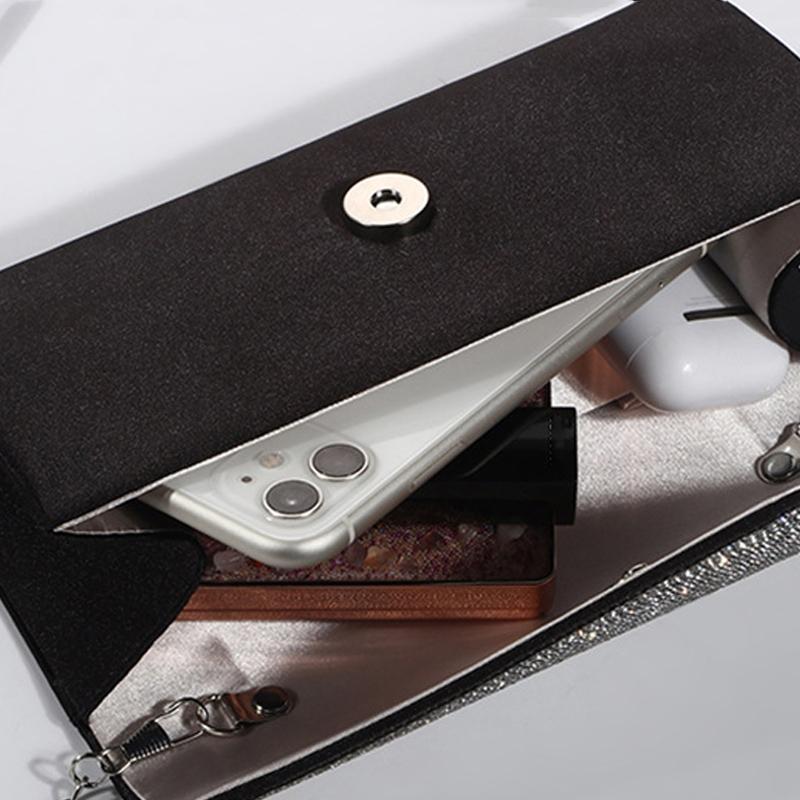 This elegant shoulder bag is designed for dinner and cosmetic use, featuring a delicate and sophisticated appearance. Crafted from high-quality rhinestones and polyester, it offers a stylish accessory for special occasions. The bag is easy to open with a magnetic buckle, combining convenience with elegance.