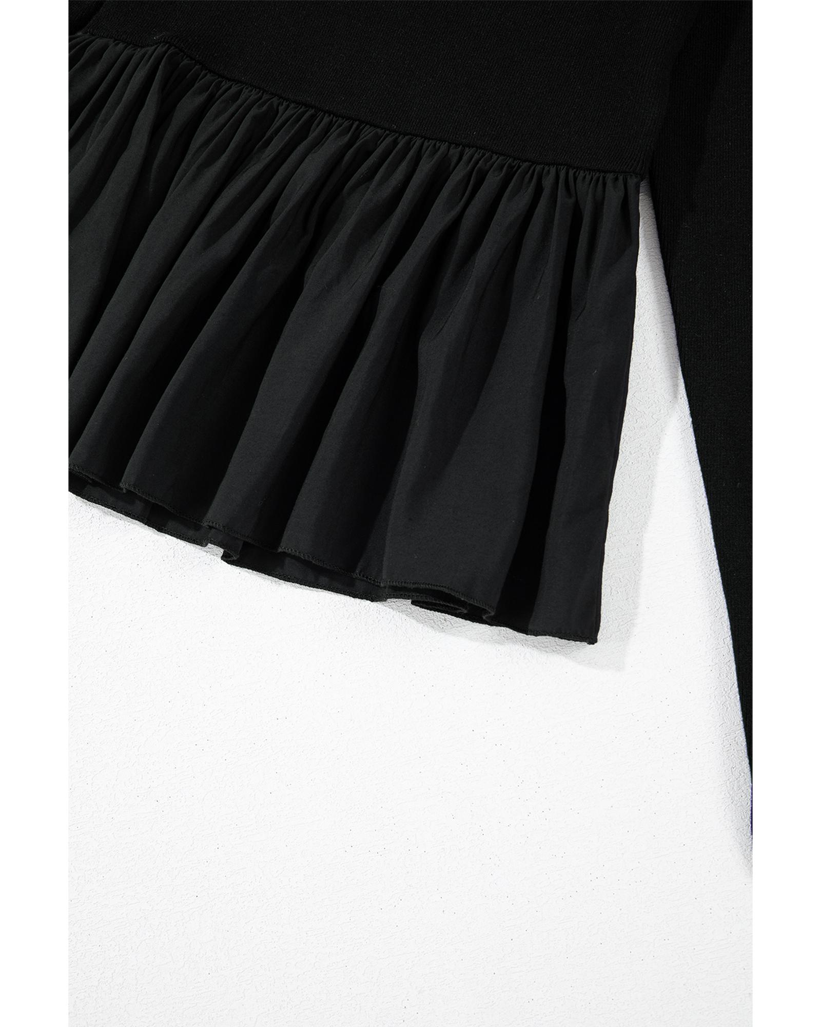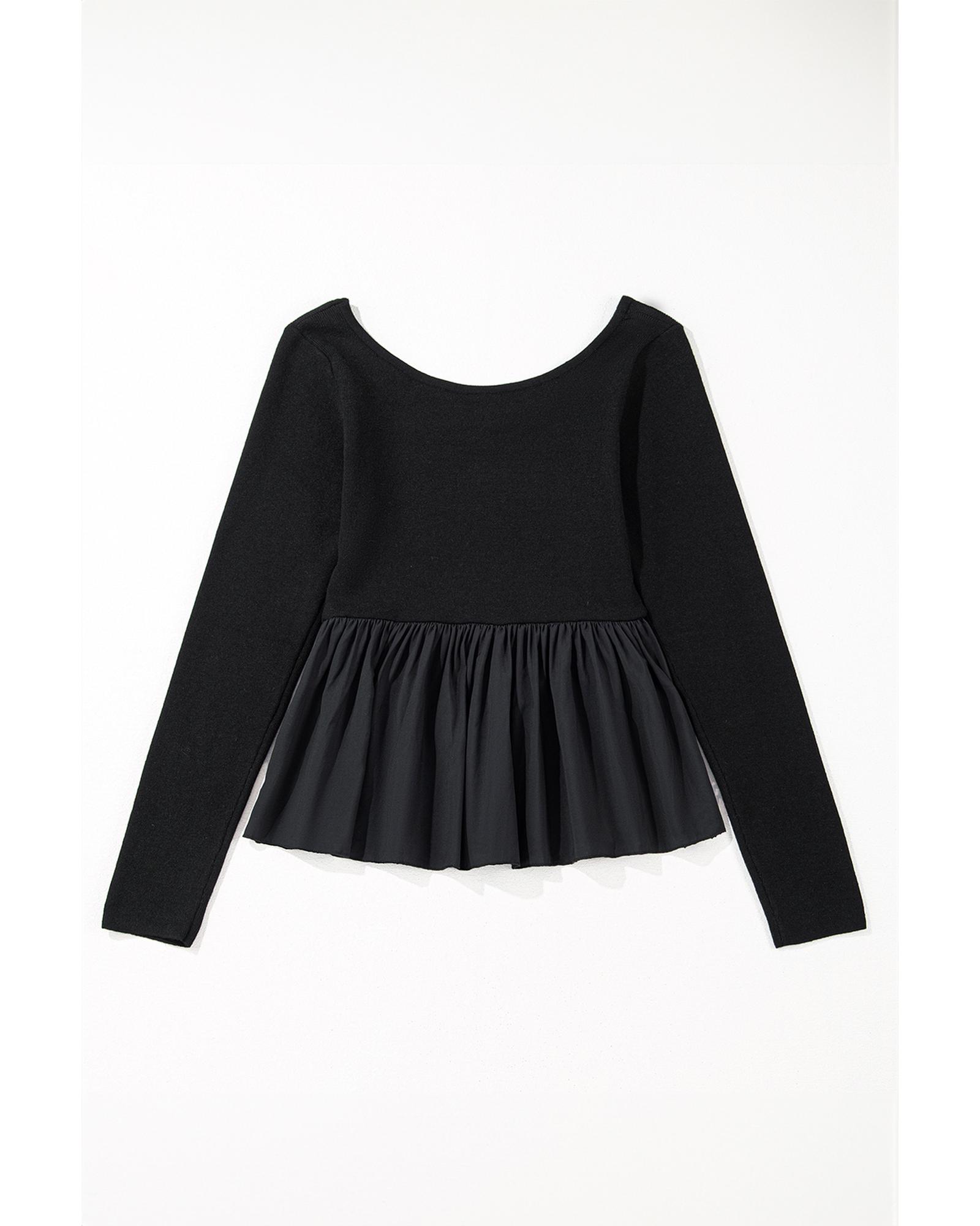 Black Ribbed Knit Long Sleeve Scoop Neck Peplum Patchwork Top – L