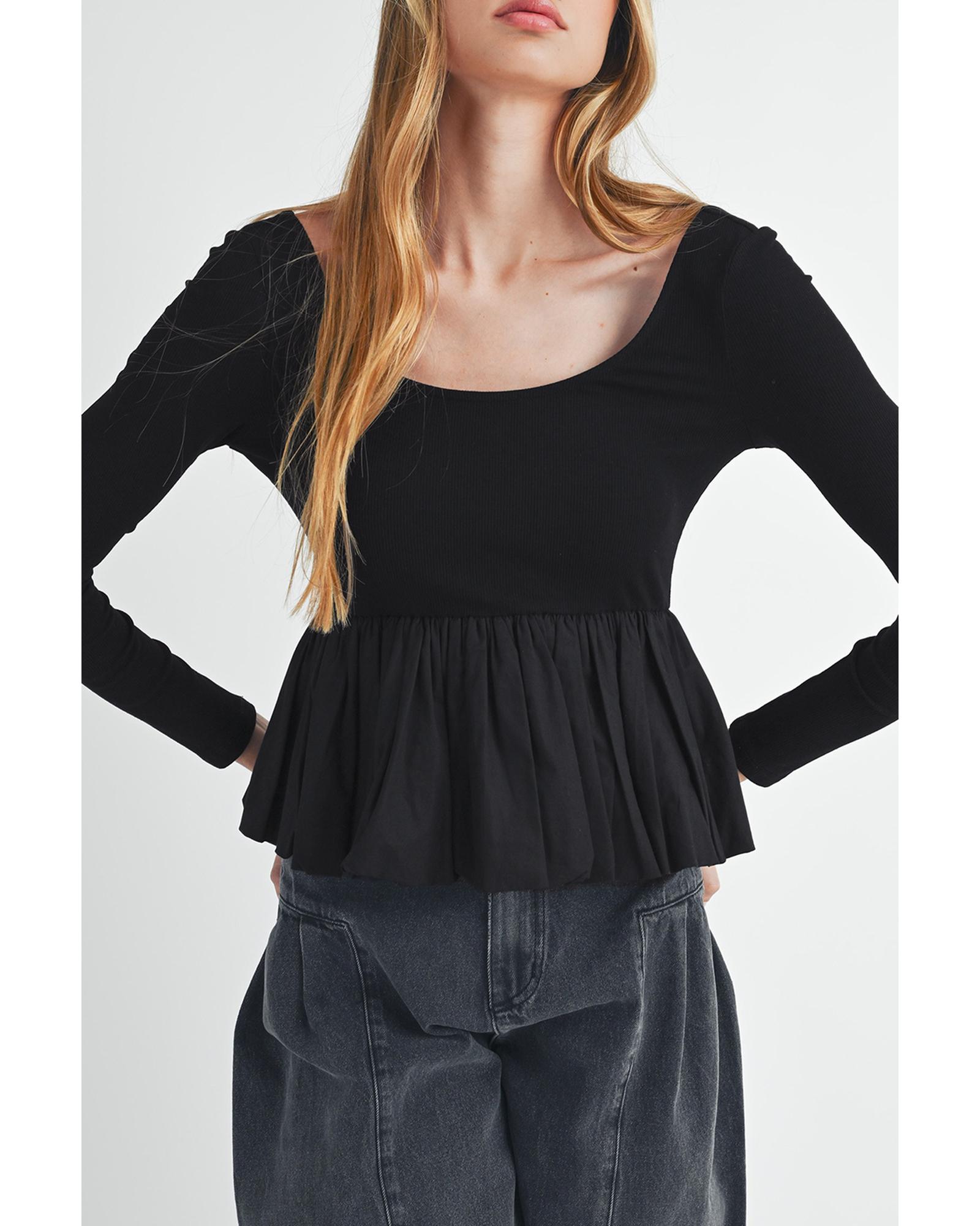 This long sleeve top features a ribbed knit texture with a scoop neckline and a peplum hem, creating a stylish and feminine silhouette. Its versatile design makes it suitable for various occasions, combining comfort with elegance.