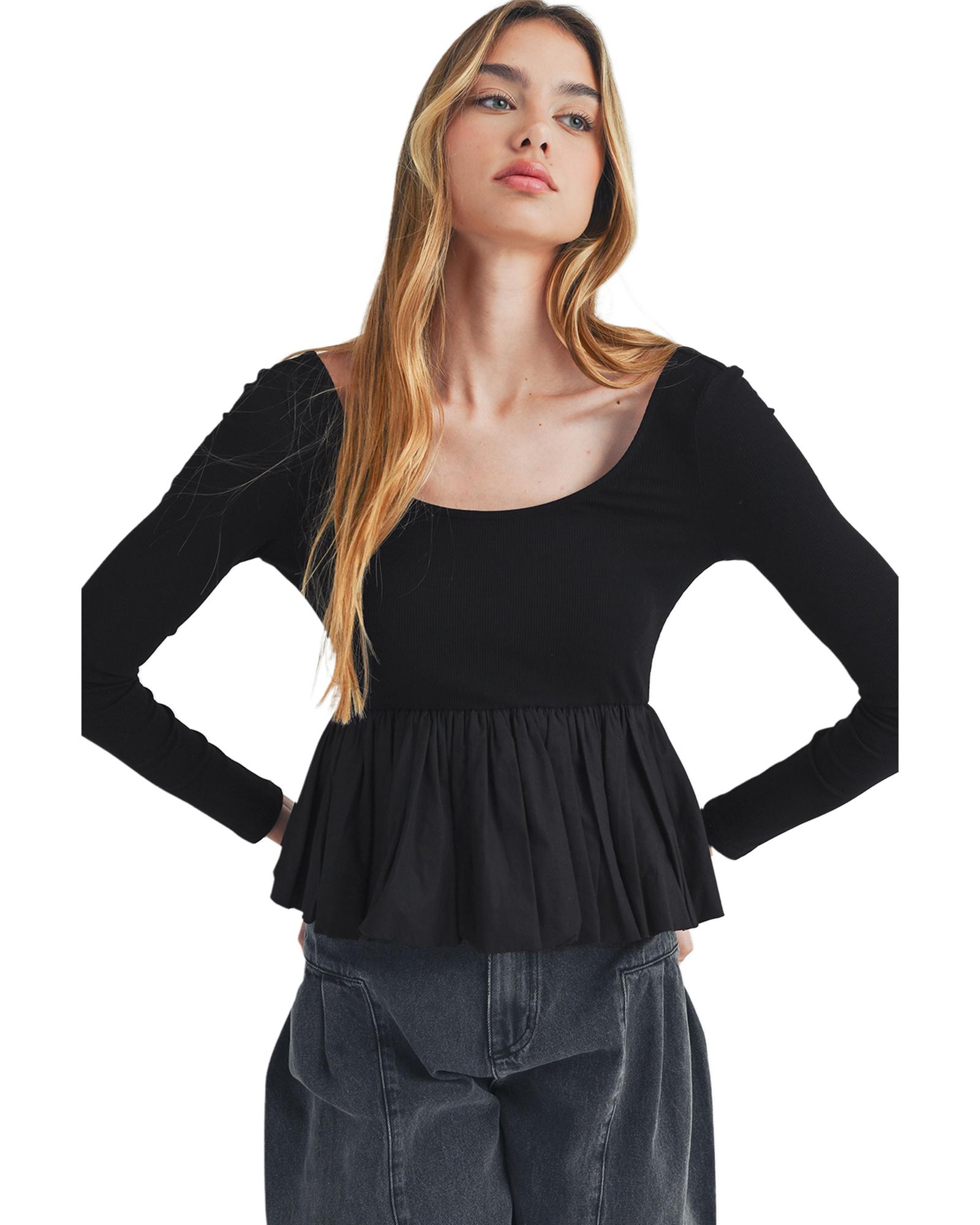 This long sleeve top features a ribbed knit fabric with a scoop neckline and a peplum hem, creating a stylish and feminine silhouette. Its textured material offers both comfort and a trendy appearance, making it suitable for various occasions.