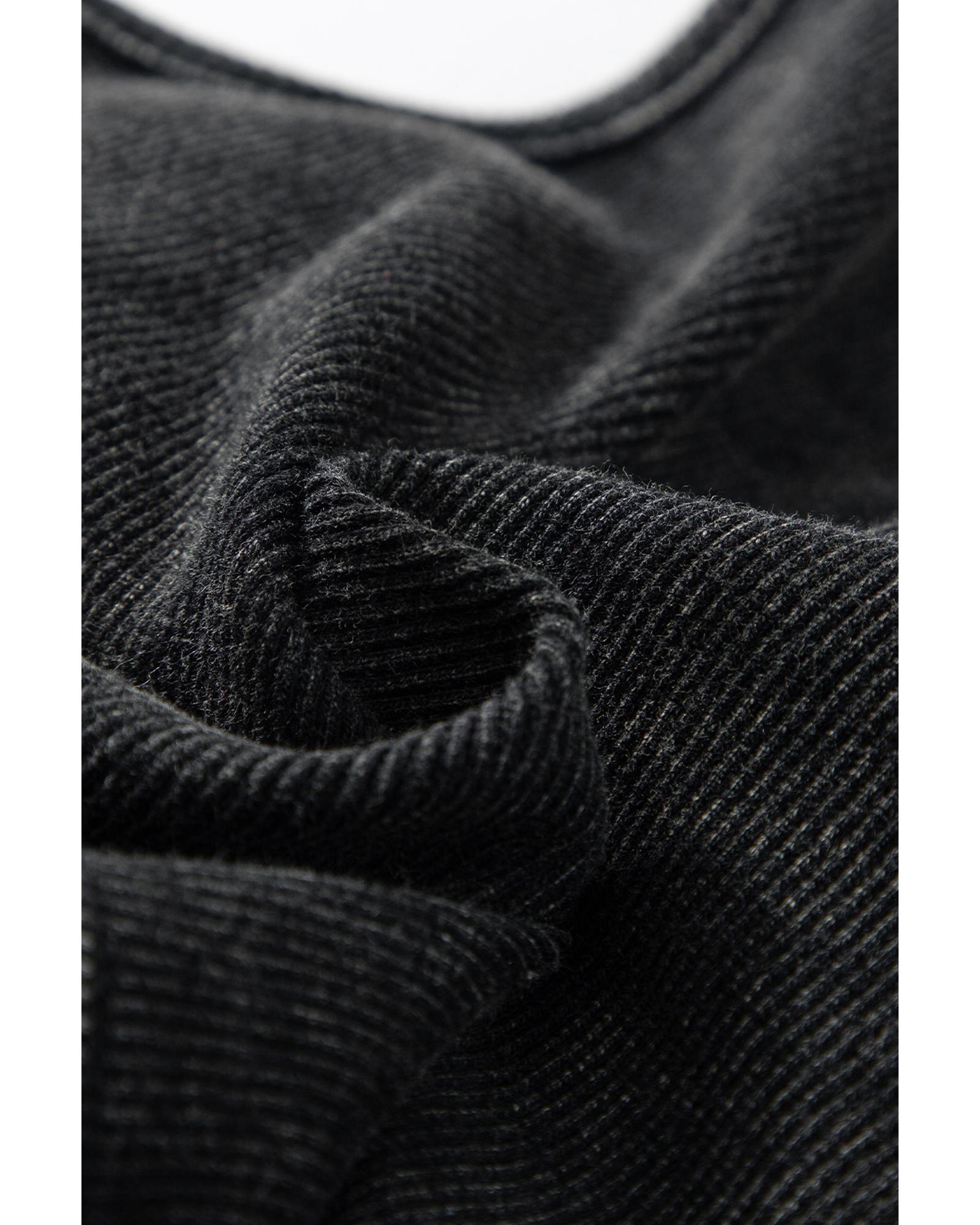 This black ribbed mineral wash racerback cropped tank top offers a trendy and edgy look with a comfortable fit. Its sleeveless design and racerback cut provide ease of movement and a cool, stylish appearance suitable for casual wear.