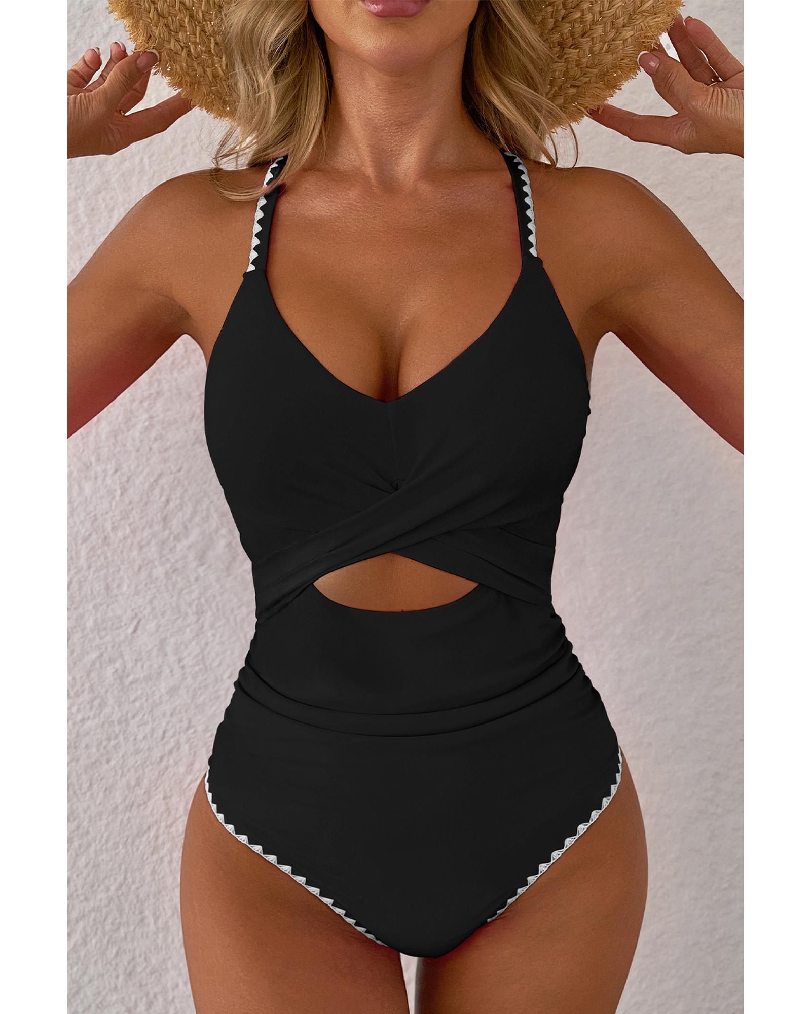 Black Ric Rac Trim Contrasted Patchwork Cutout One Piece Swimsuit – S