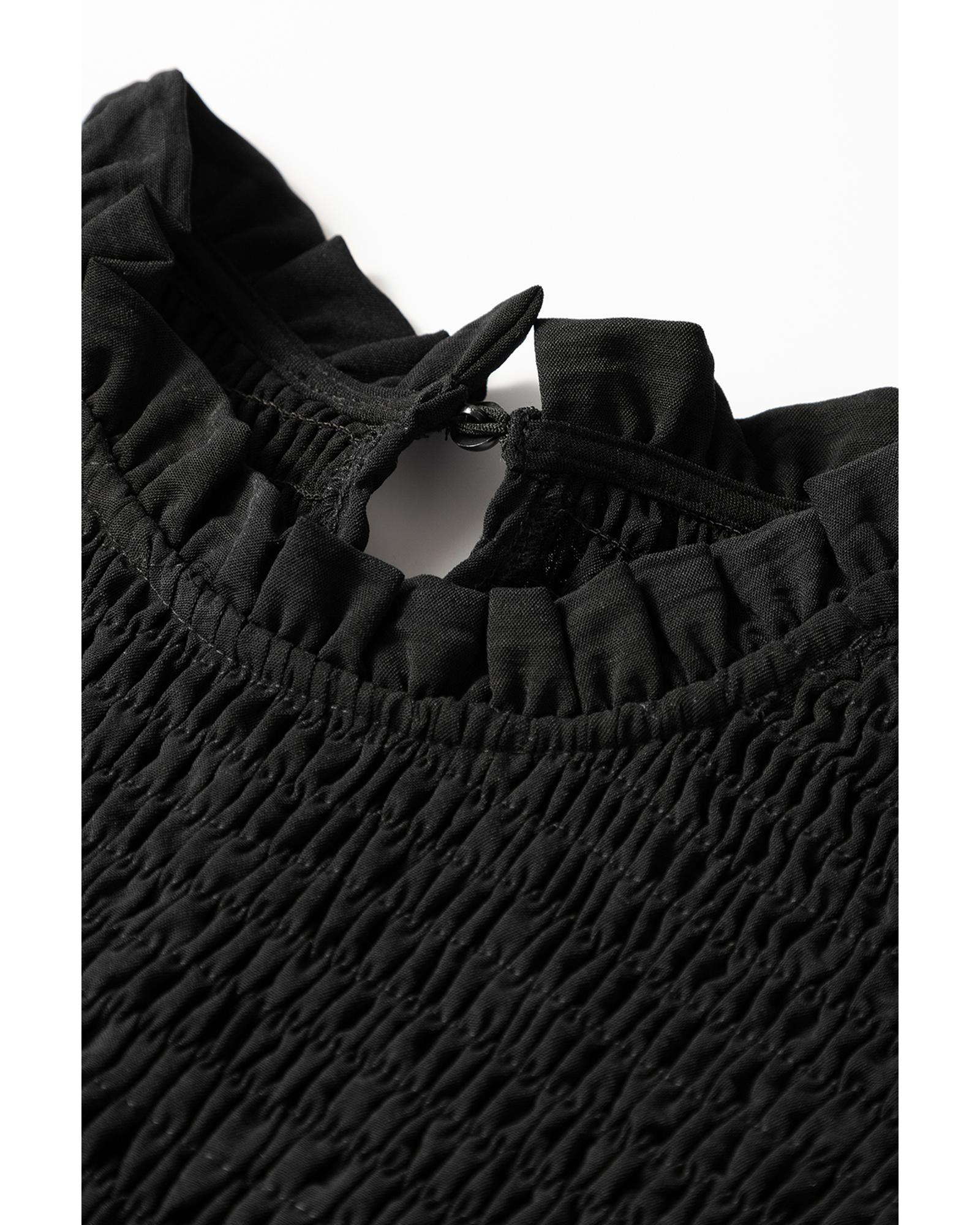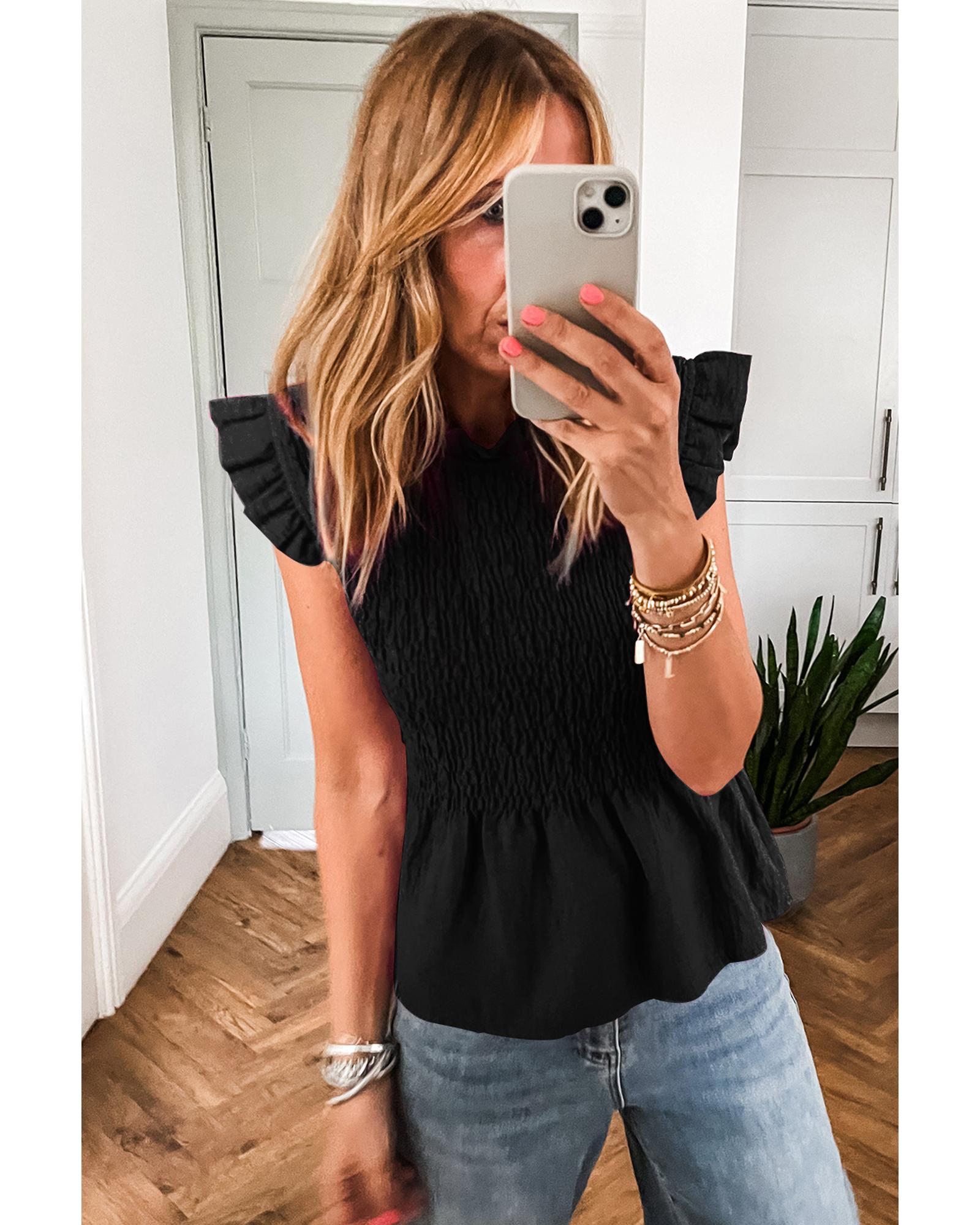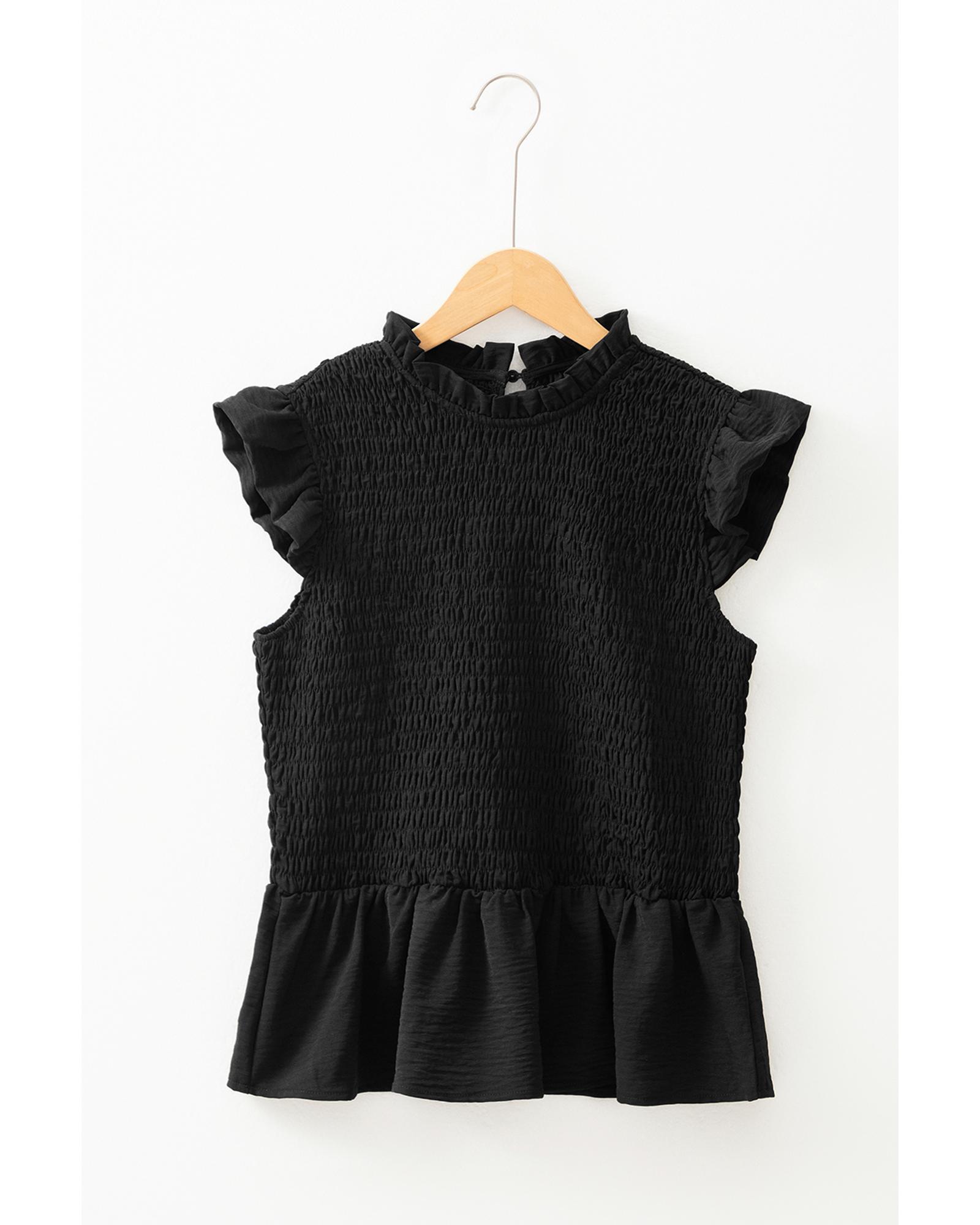 This black ruffle short sleeve shirred peplum top offers a stylish and flattering fit, designed to enhance your silhouette. It features elegant ruffled sleeves and detailed shirring, combined with a chic peplum design for a fashionable look. Made from lightweight polyester, it provides comfort and a sleek appearance.
