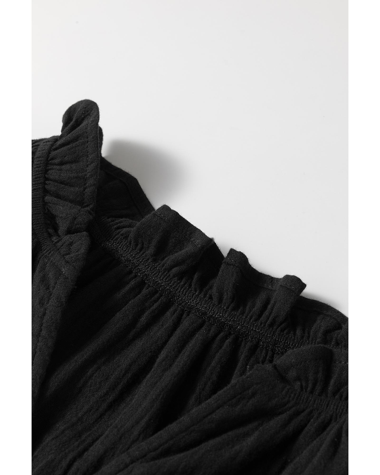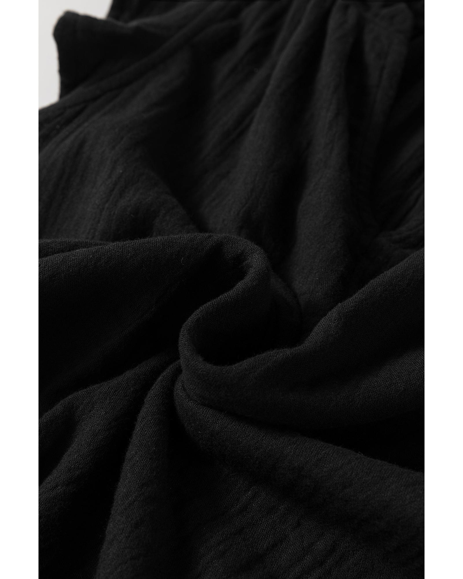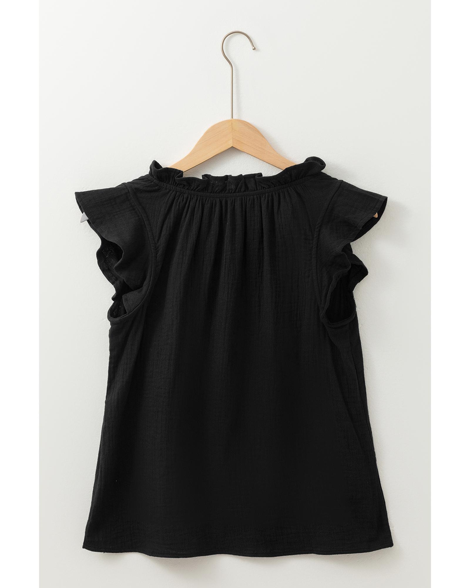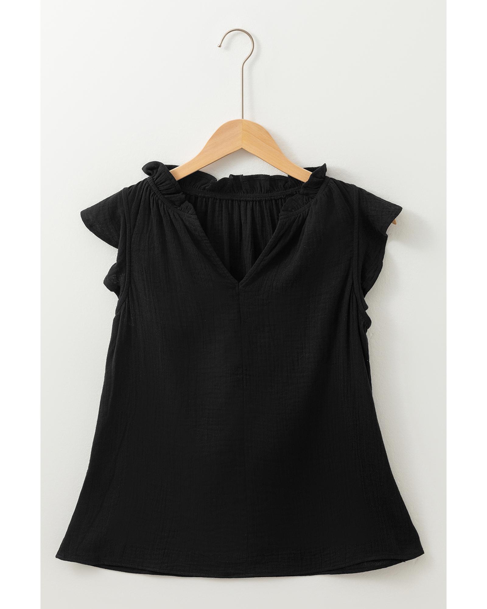 This black ruffled shoulder V neck shift tank top combines stylish design with comfortable wear. The ruffled shoulder detail adds a playful touch, while the V neck design accentuates the neckline. Made from 100% cotton, it features a unique crinkled texture that adds depth and visual interest. The classic solid color makes it versatile for various outfits.