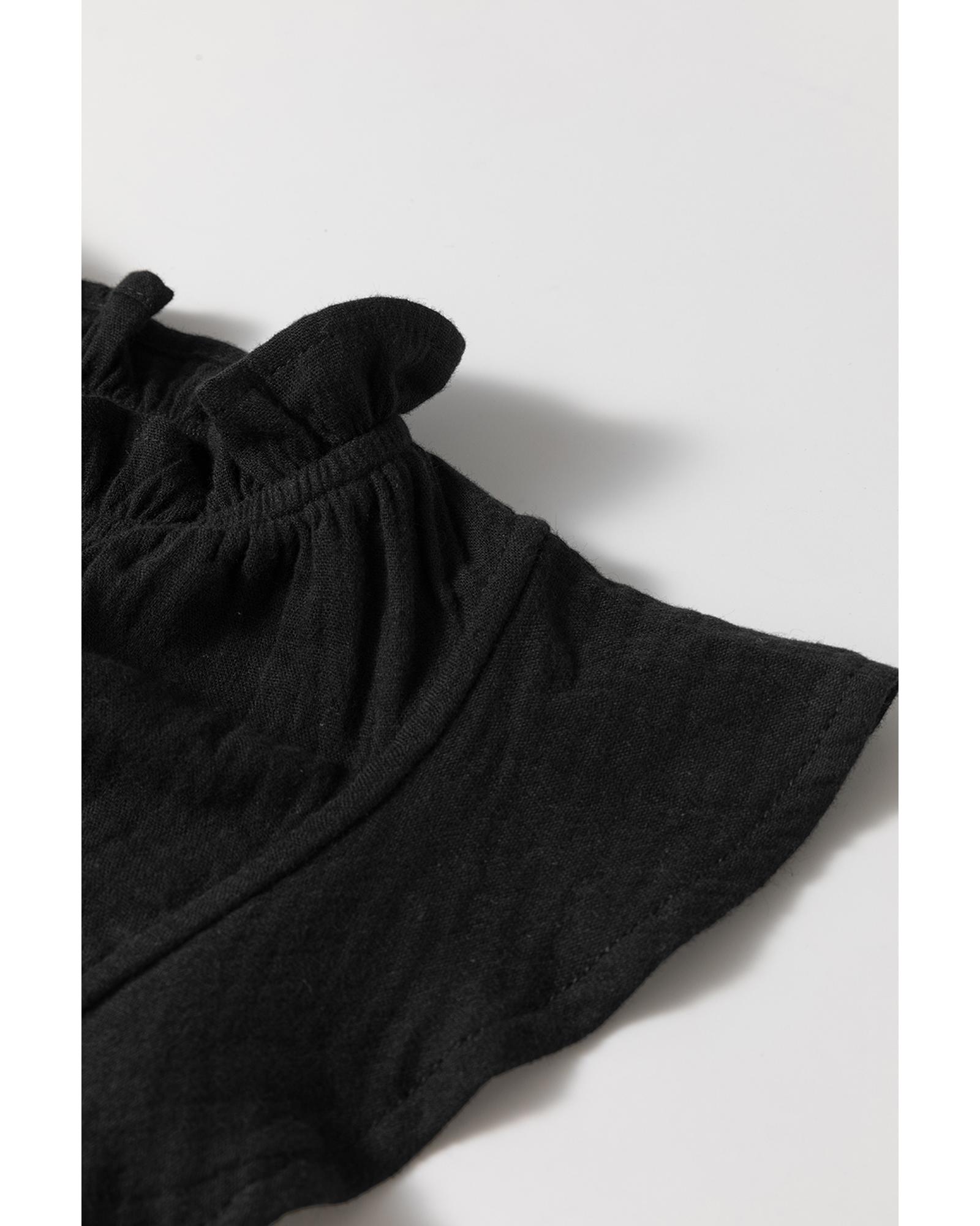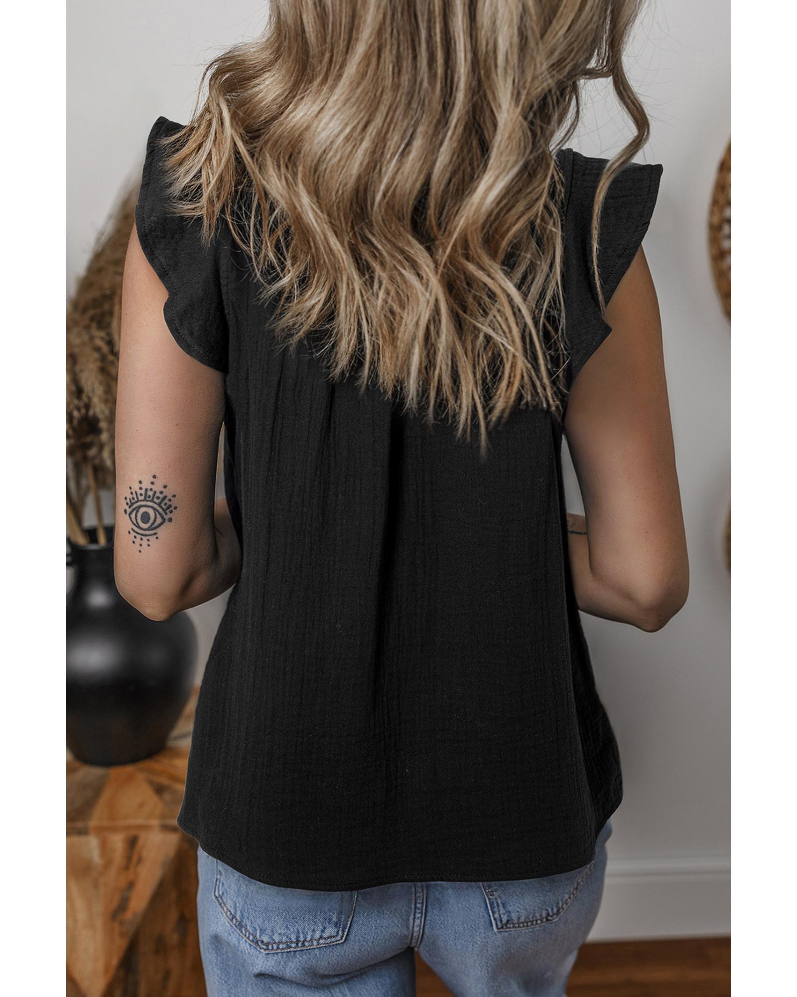 This black ruffled shoulder V-neck shift tank top combines stylish design with comfortable wear. The ruffled shoulder detail adds a playful touch, while the V-neck design accentuates the neckline. Its classic solid color makes it versatile for various outfits, and the unique crinkled texture adds depth and visual interest.