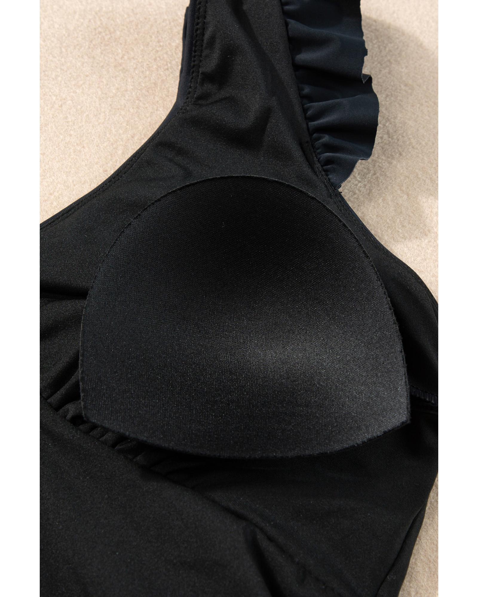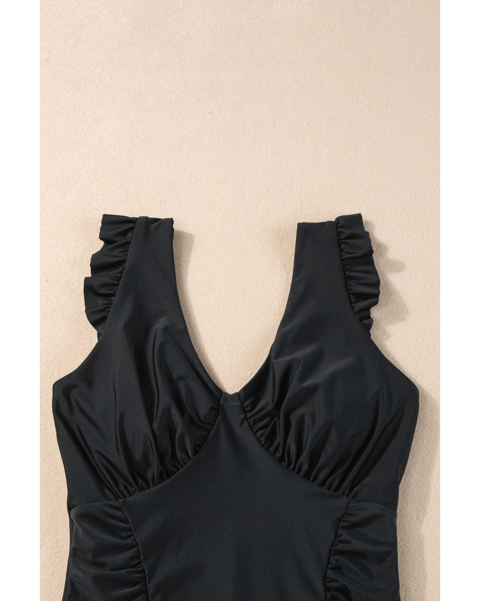 This stylish one-piece bathing suit features a black ruffled trim design with a ruched detail that enhances its trendy and fitted appearance. It is designed with a sexy V-neckline and sleeveless cut, making it ideal for summer vacations and beach outings.