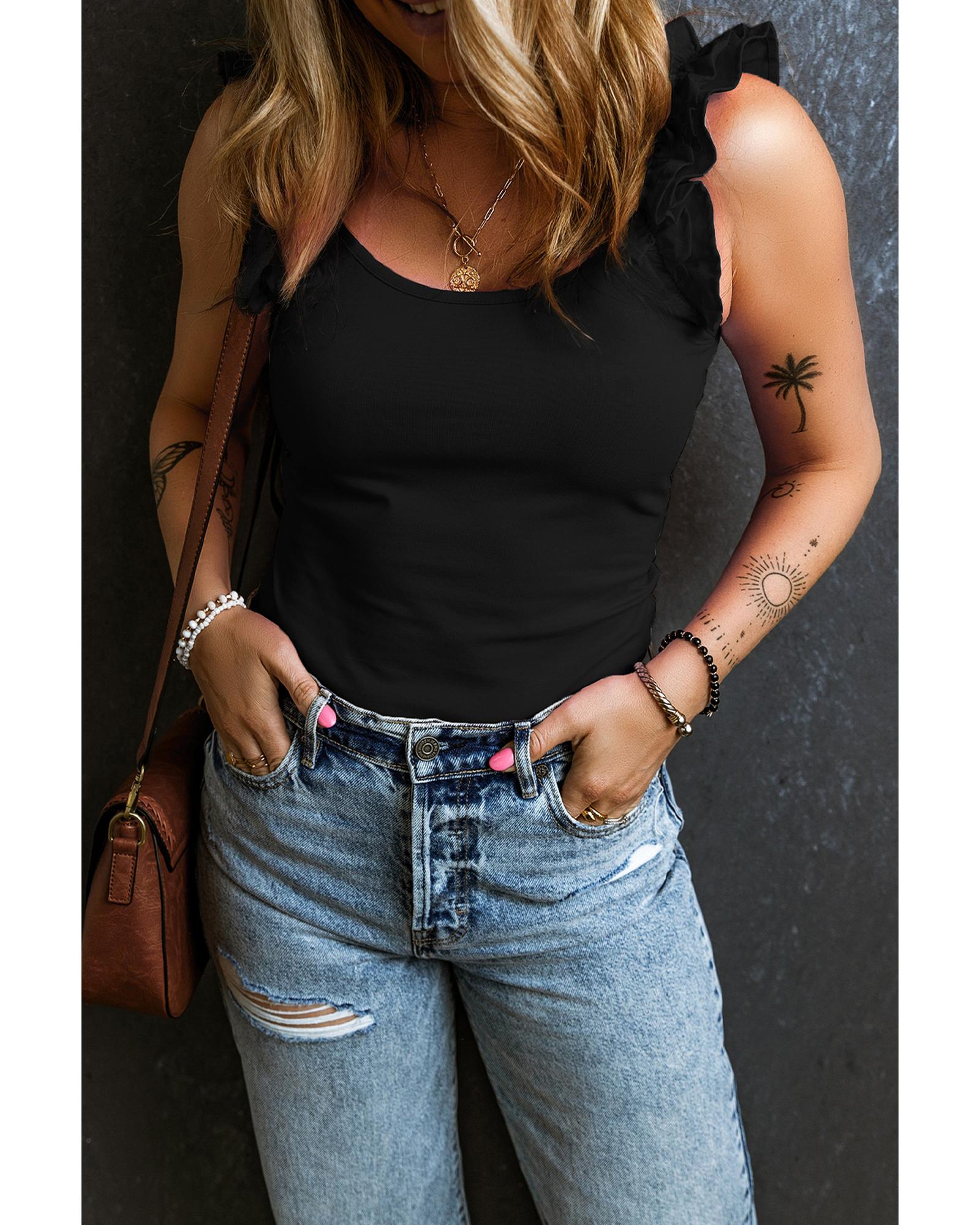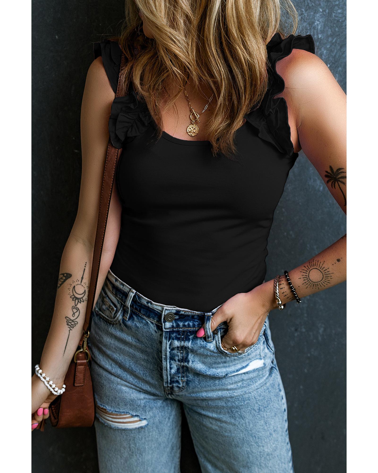 This black ruffled wide straps slim tank top offers a stylish and comfortable fit, perfect for casual wear. Its sleeveless design and ruffled straps add a charming touch, while the low neckline highlights collarbones and back curves. Made from soft, breathable fabric with high elasticity, it ensures all-day comfort and a flattering silhouette.