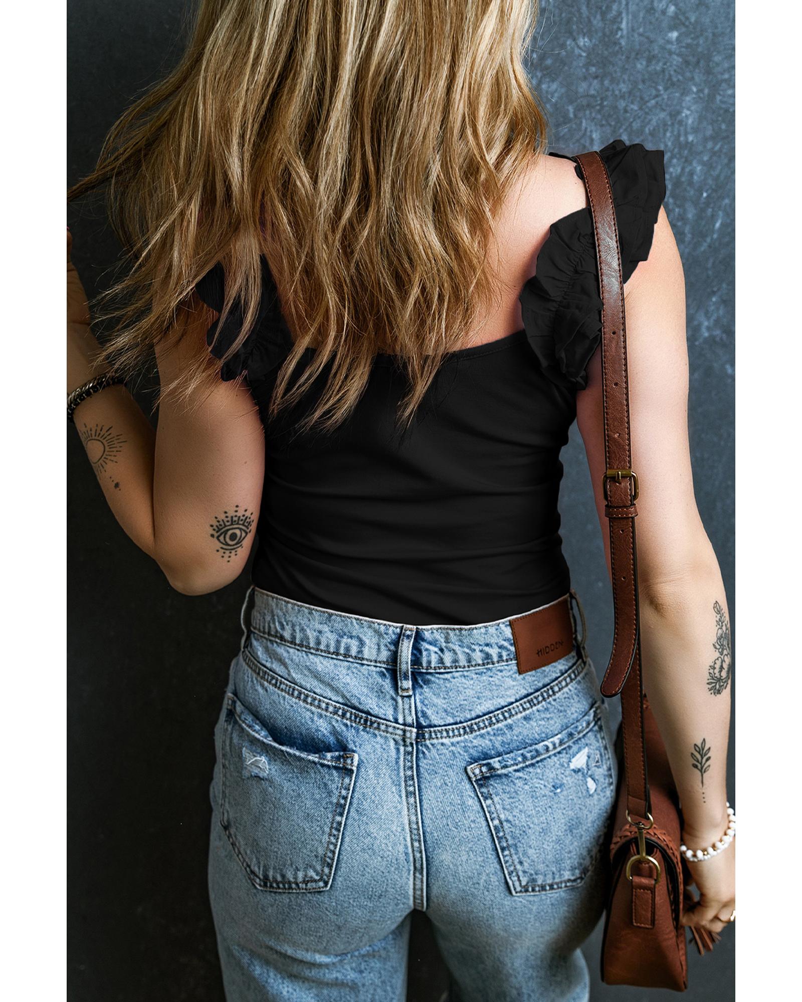 This black ruffled wide straps slim tank top offers a stylish and comfortable fit, perfect for casual wear. Its sleeveless design and ruffled straps add a charming touch, while the low neckline highlights collarbones and back curves. Made from soft, breathable fabric with high elasticity, it ensures all-day comfort and a flattering silhouette.
