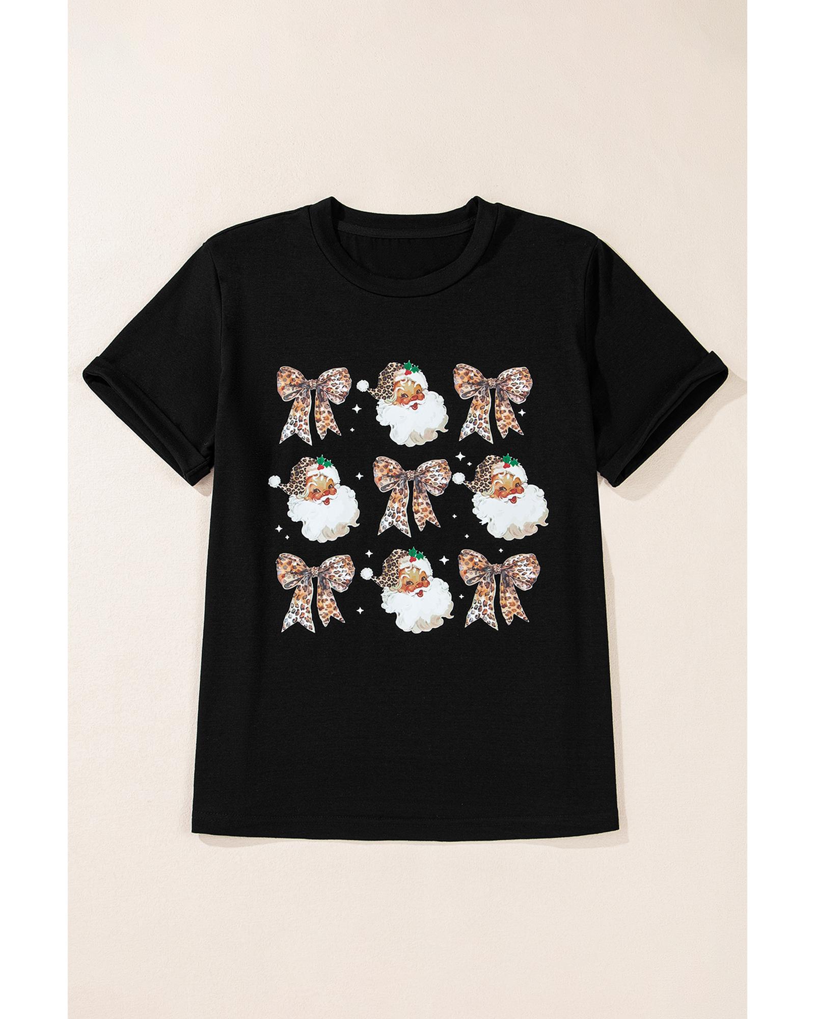This casual T-shirt features a festive holiday theme with a Santa Claus graphic accented by a leopard print bow. Designed with a trendy fitted look, it offers a comfortable and stylish option for casual wear during the holiday season. The crew neck and short sleeves provide a classic silhouette suitable for pairing with jeans or casual pants.