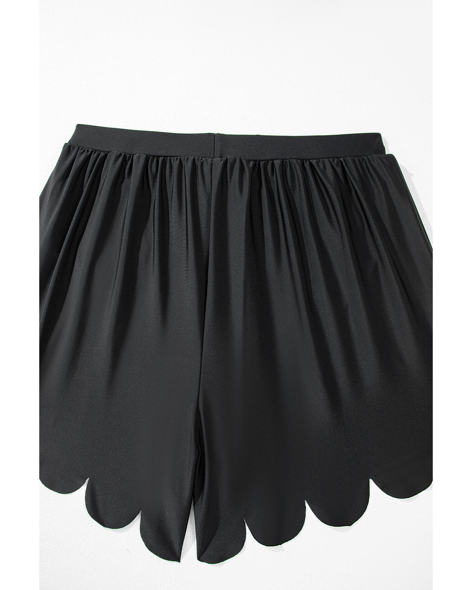These beach shorts feature a stylish scalloped trim that adds a feminine and graceful touch. Designed with a trendy fitted look, they are versatile and suitable for both beach days and casual outings. The solid color makes them easy to pair with any swim top, creating a chic and effortless look.
