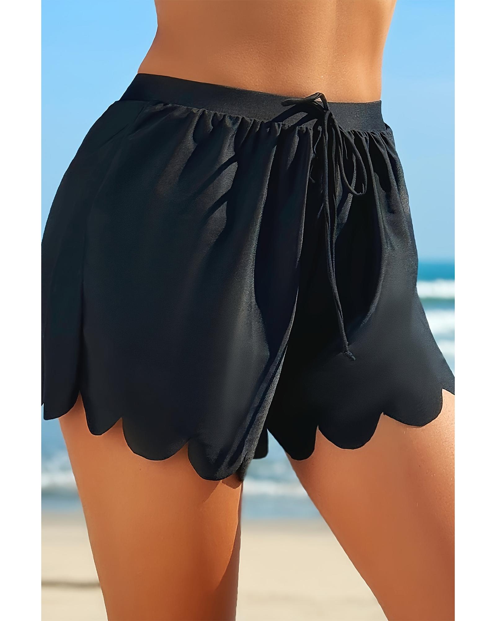 These beach shorts feature a stylish scalloped trim that adds a feminine and graceful touch. Designed with a trendy fitted look, they are versatile and suitable for both beach days and casual outings. The solid color makes them easy to pair with any swim top, creating a chic and effortless style.