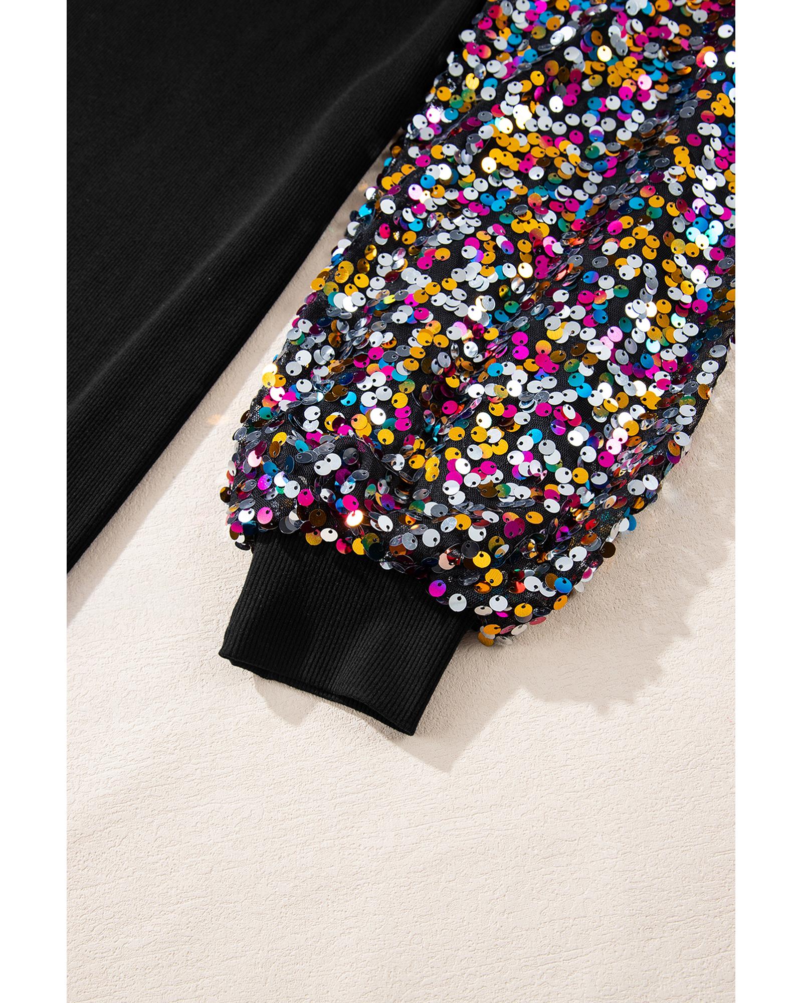 Black Sequin Bishop Sleeve U Neck Mini Sweater Dress – L