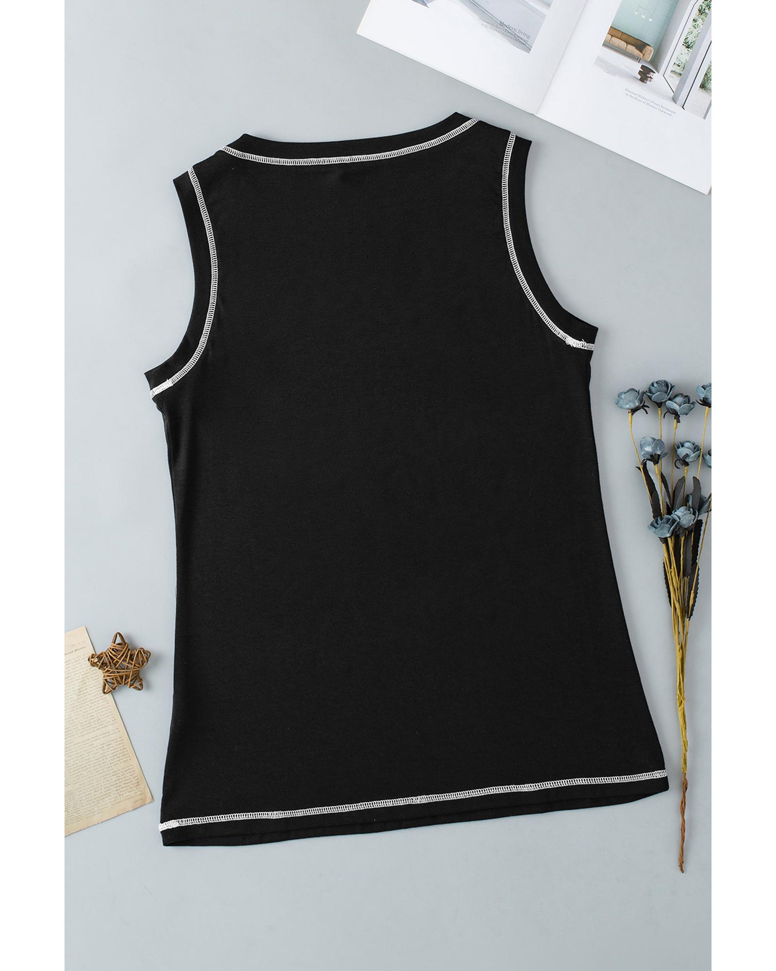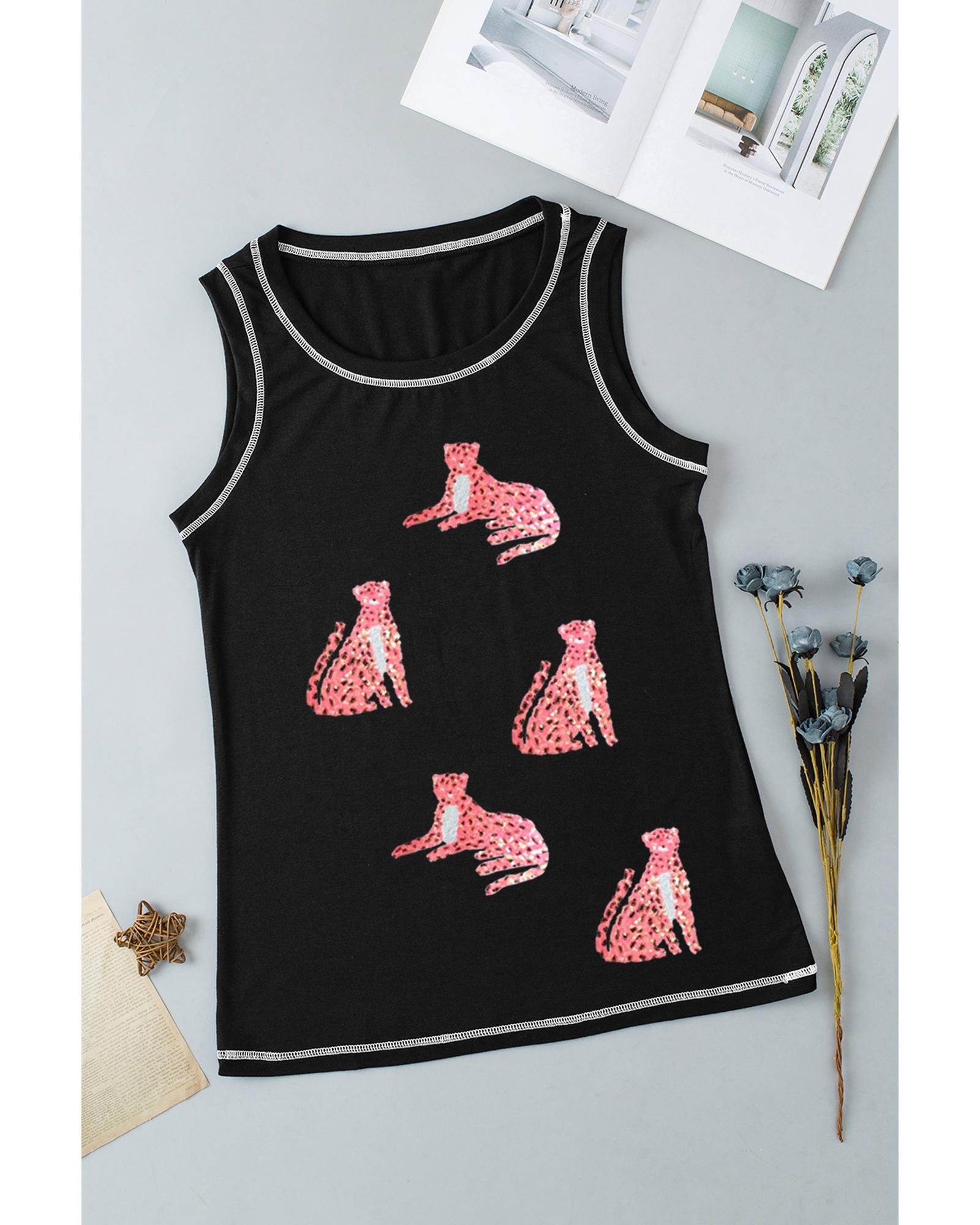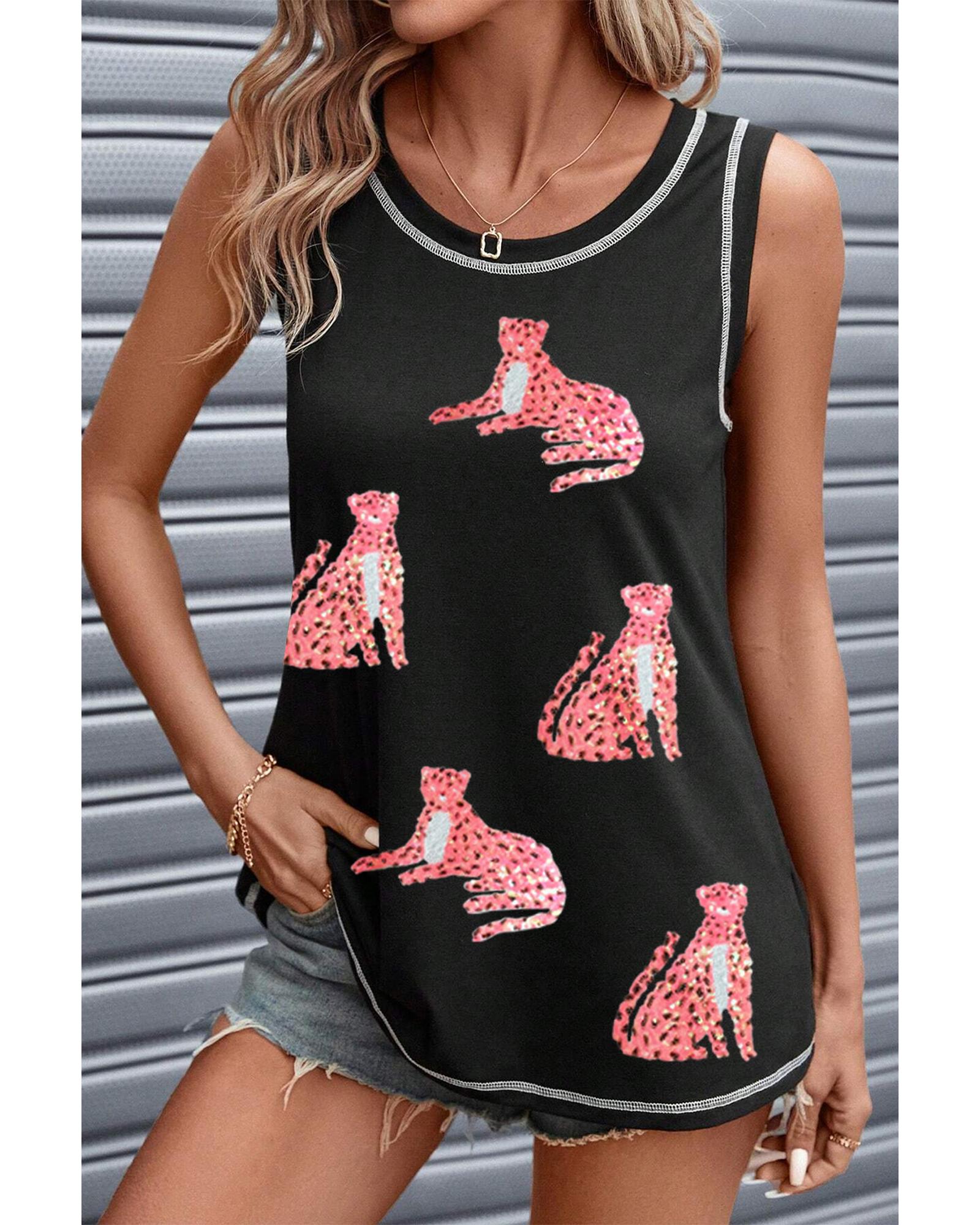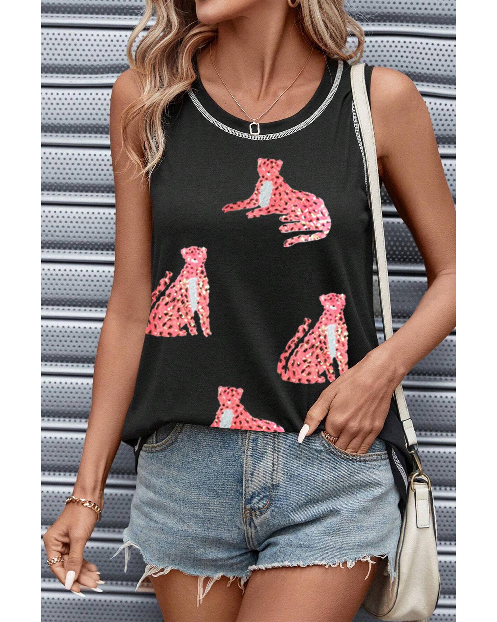 Black Sequin Cheetah Round Neck Stitching Loose Tank Top – S