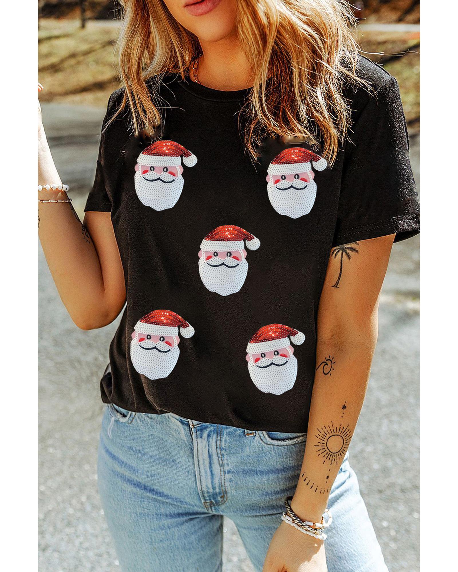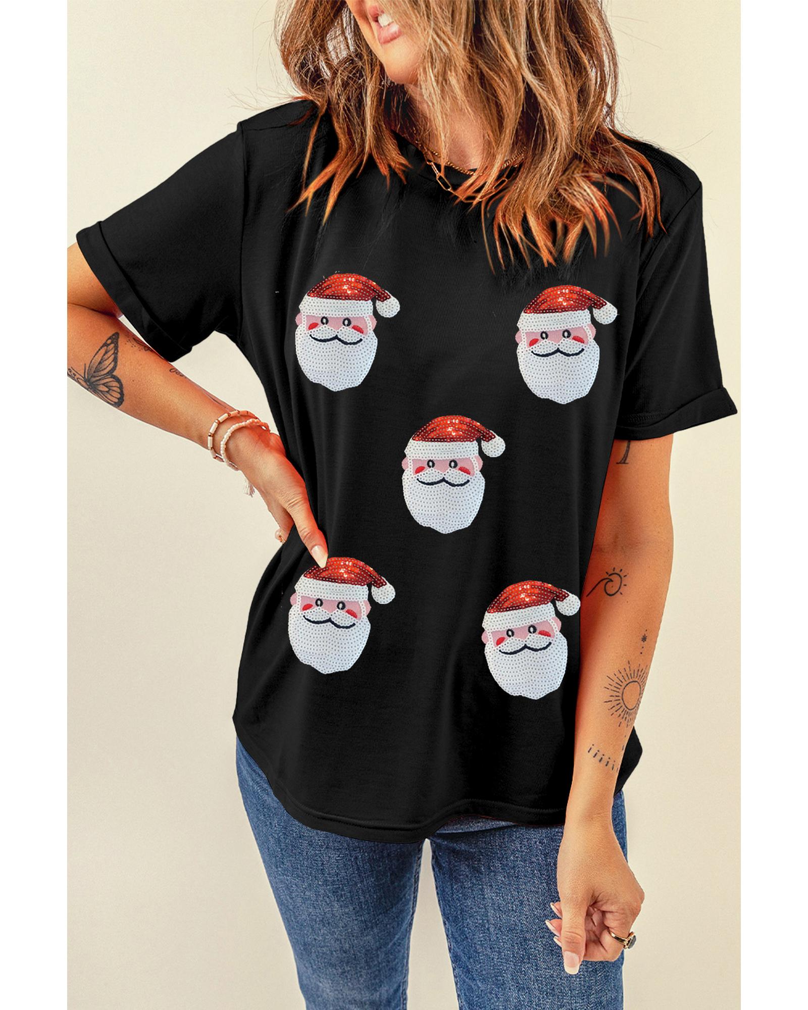This festive crewneck T-shirt features a stylish Christmas Claus pattern adorned with sequins, adding a touch of glamour to your holiday wardrobe. Designed with a trendy fitted silhouette, it is perfect for celebrating the holiday season with a cheerful and fashionable look.