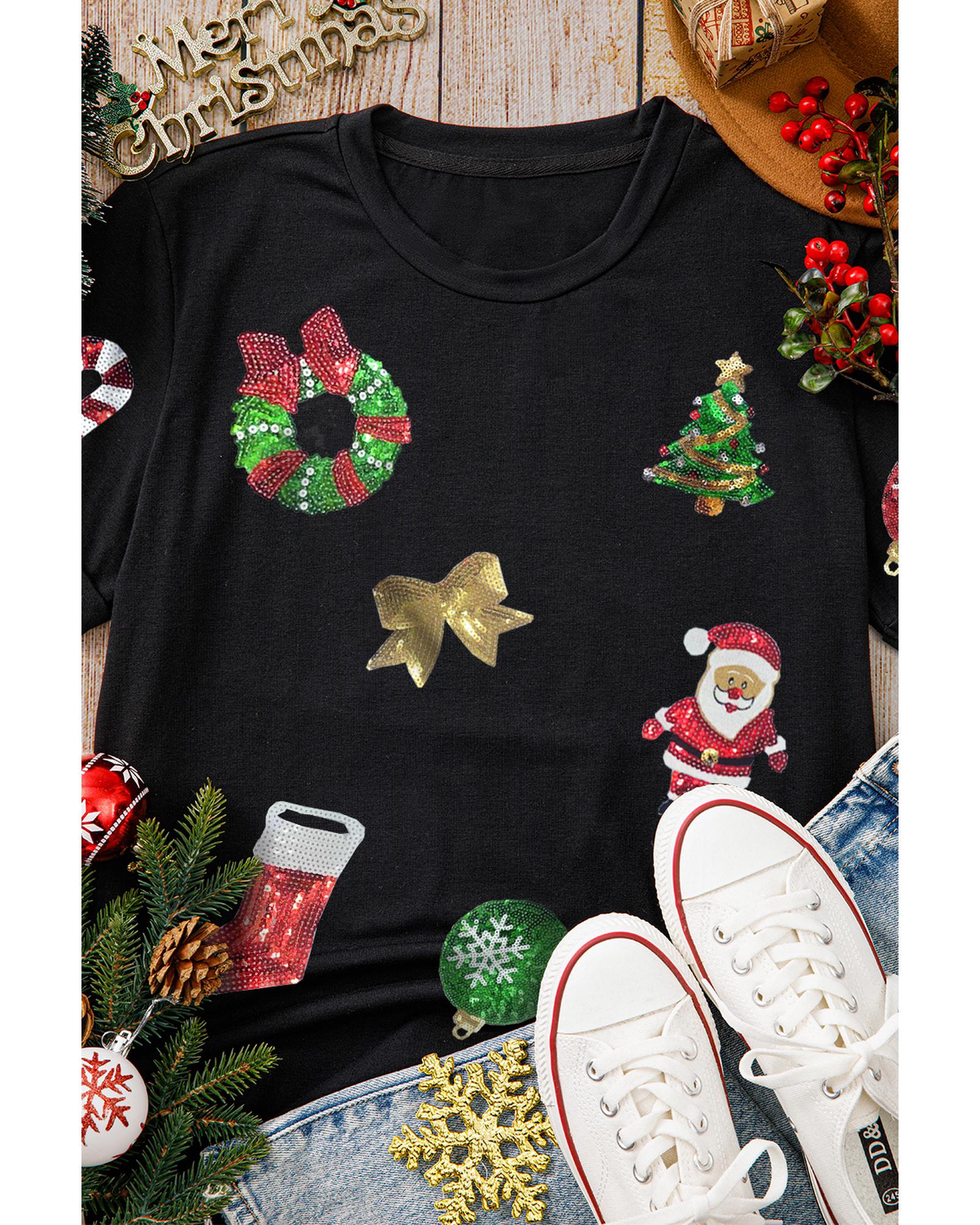This festive crewneck T-shirt features a stylish design with sequin embellishments and holiday-themed graphics, making it a perfect addition to your Christmas wardrobe. Crafted for comfort and a trendy fit, it is suitable for various casual and holiday occasions.