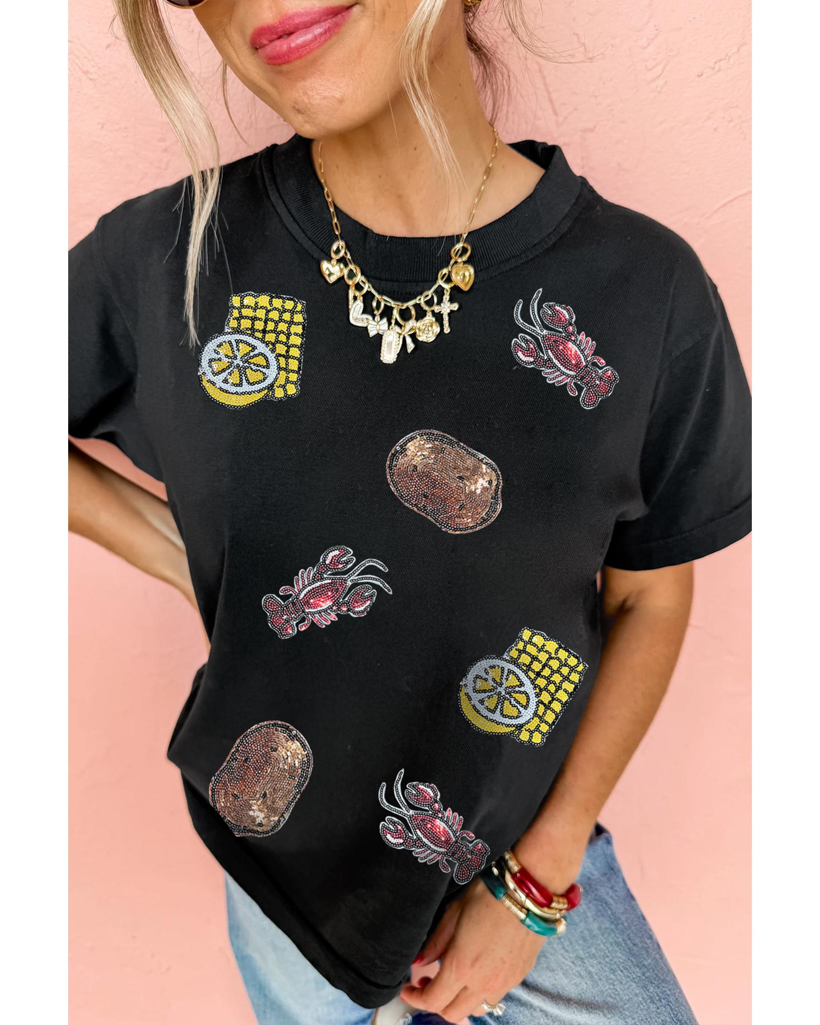 This black crewneck T-shirt features a playful graphic design with crawfish, corn, lemon, and potatoes, accented with sequins for added sparkle. It is suitable for casual or festive occasions and pairs well with jeans, shorts, or skirts. The shirt is available in multiple sizes and offers a comfortable fit.