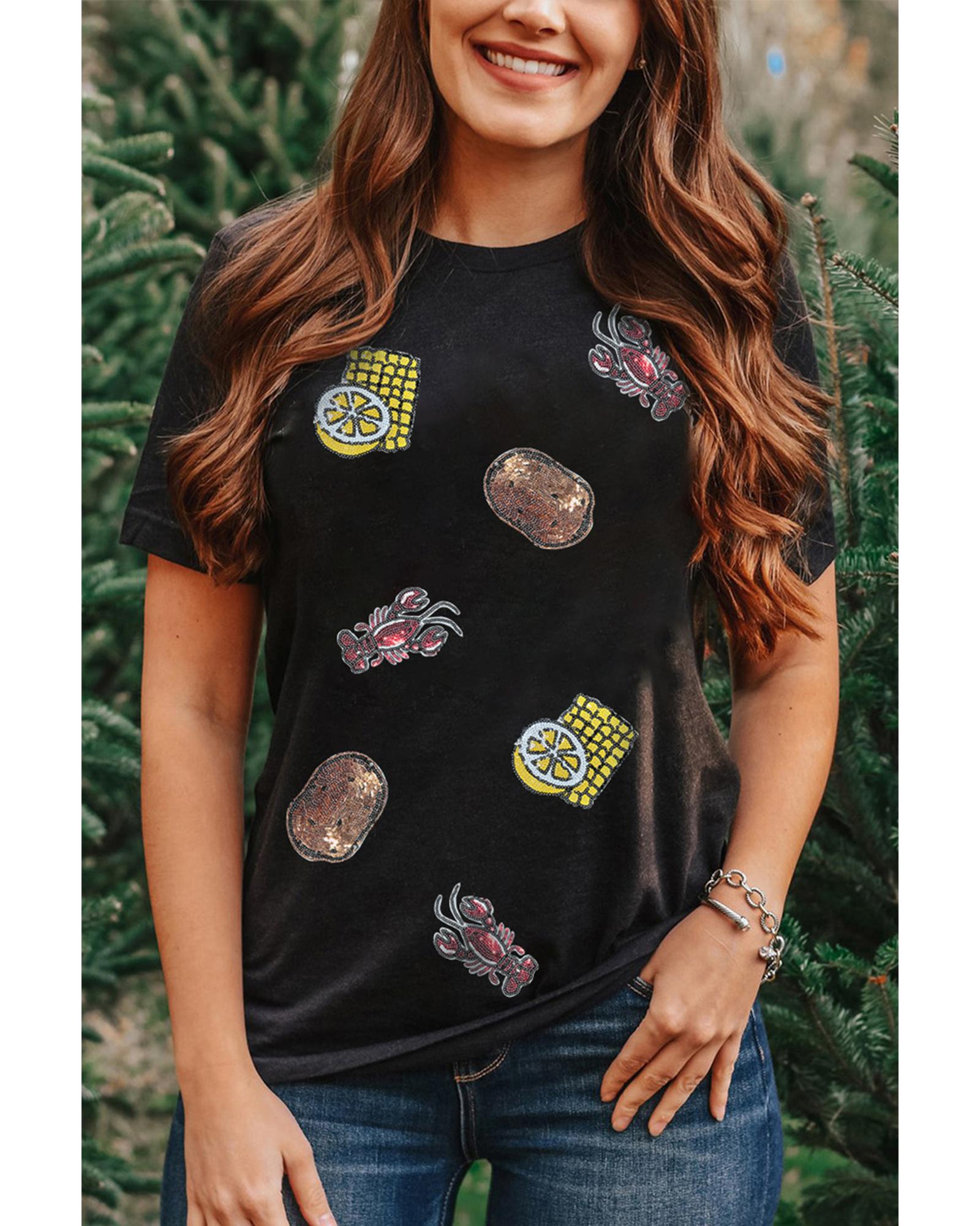 Black Sequin Crawfish Potato Lemon Corn Graphic Crewneck T Shirt – S