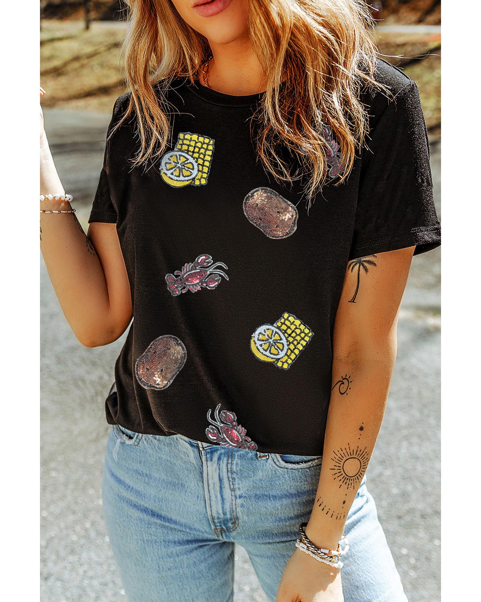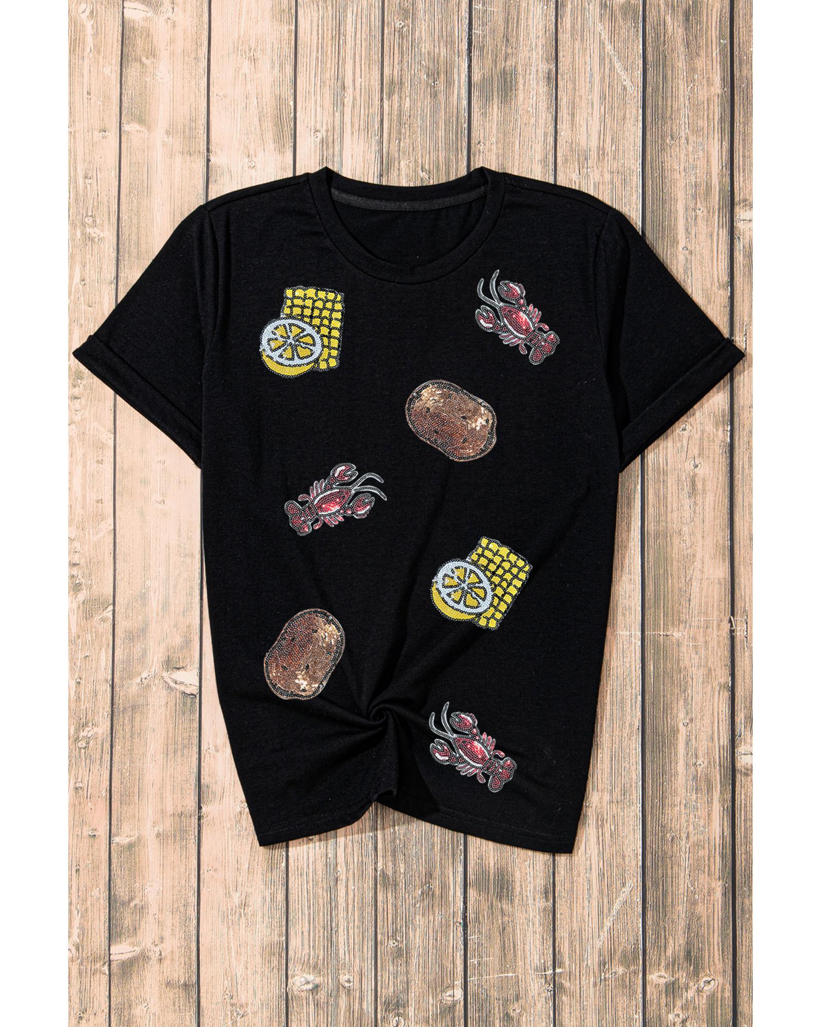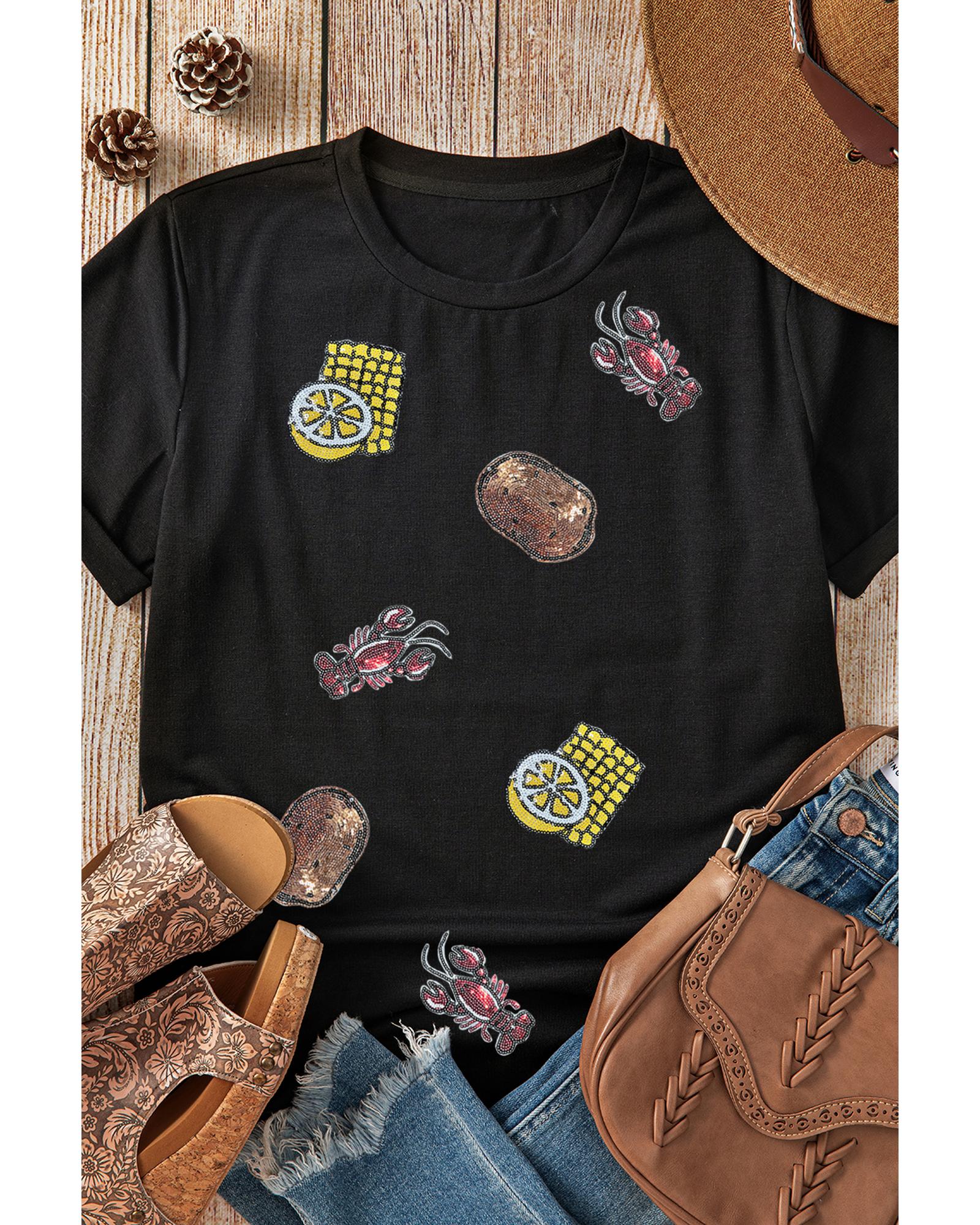 This crewneck T-shirt features a playful graphic design with crawfish, corn, lemon, and potatoes, accented with sequins for added sparkle. It is suitable for casual or festive occasions and pairs well with jeans, shorts, or skirts. The shirt is available in multiple sizes and offers a comfortable fit.