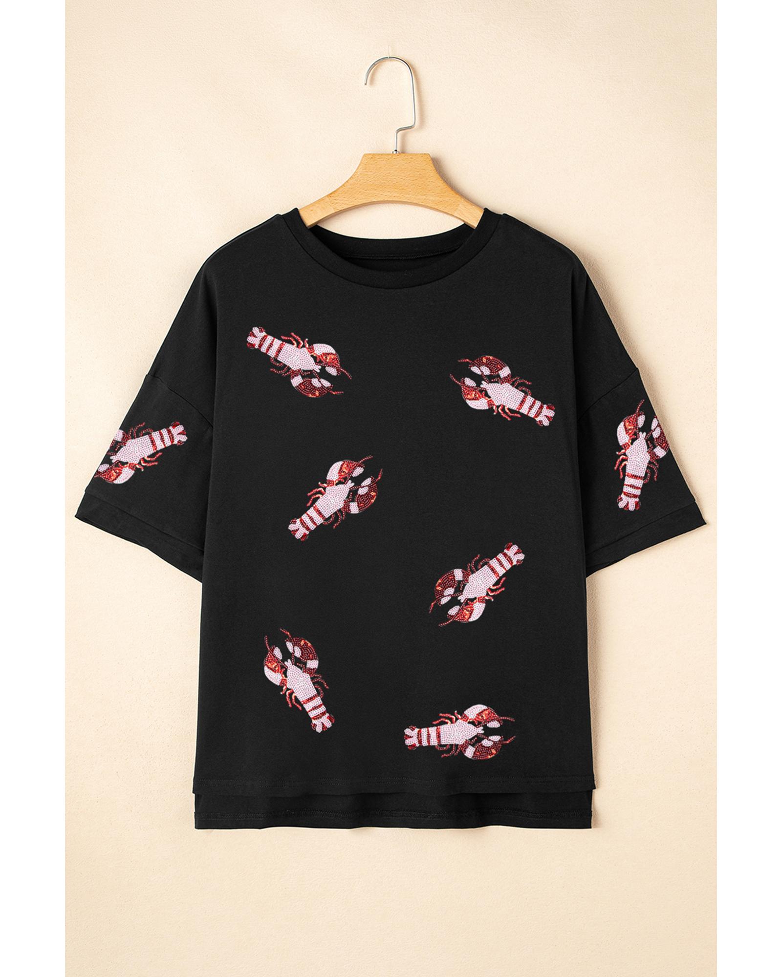 Black Sequin Crayfish Graphic Drop Sleeve High Low Tee – S