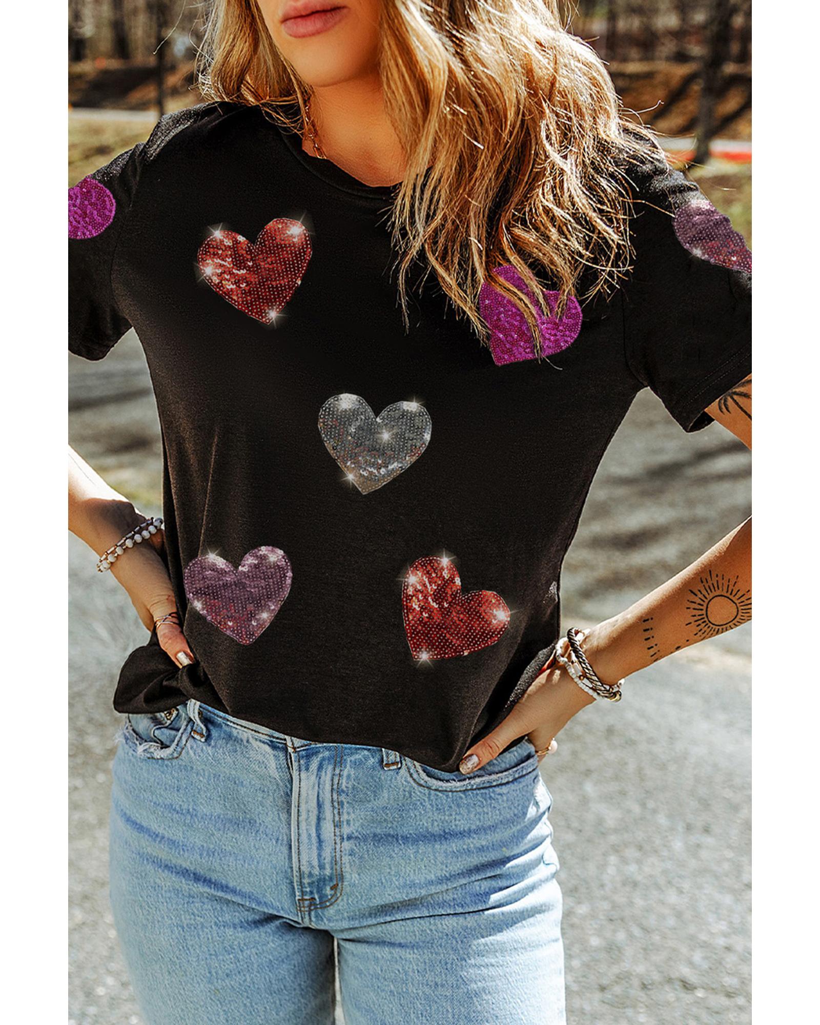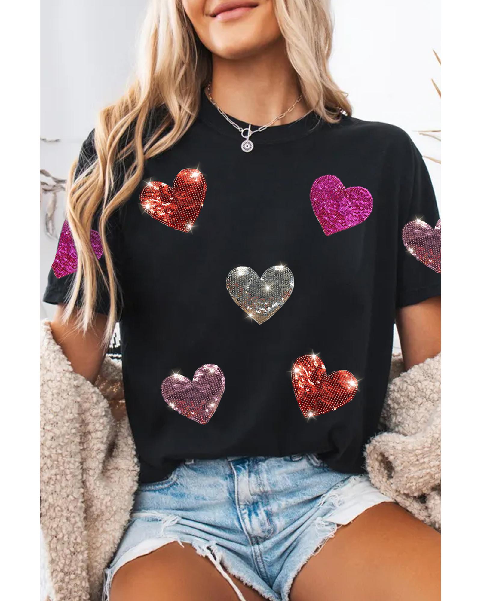 Black Sequin Heart Patched Pattern Crewneck Valentines Tee – L