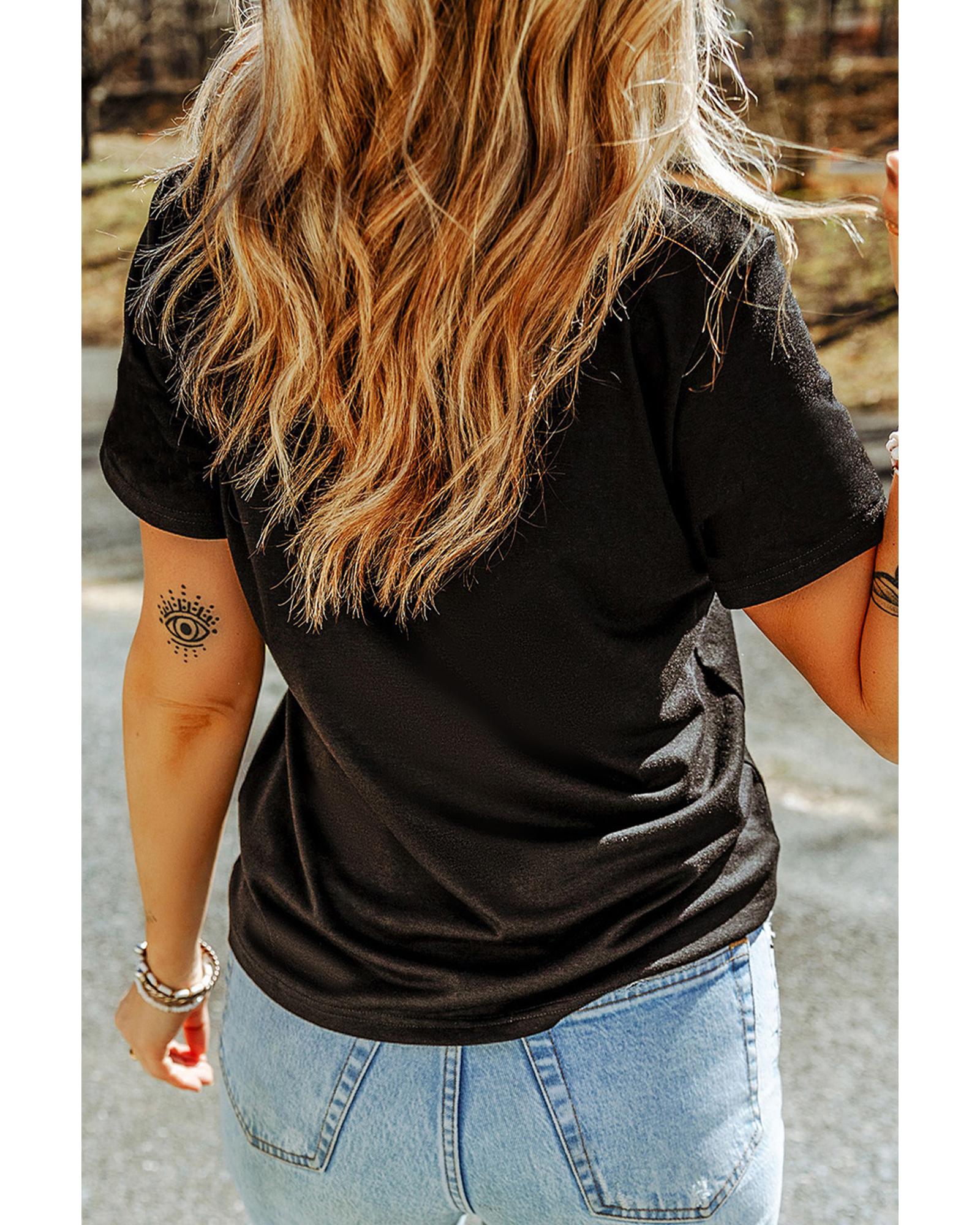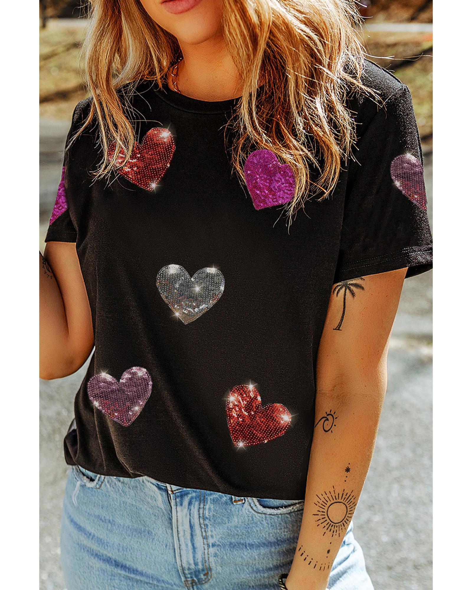 Black Sequin Heart Patched Pattern Crewneck Valentines Tee – S