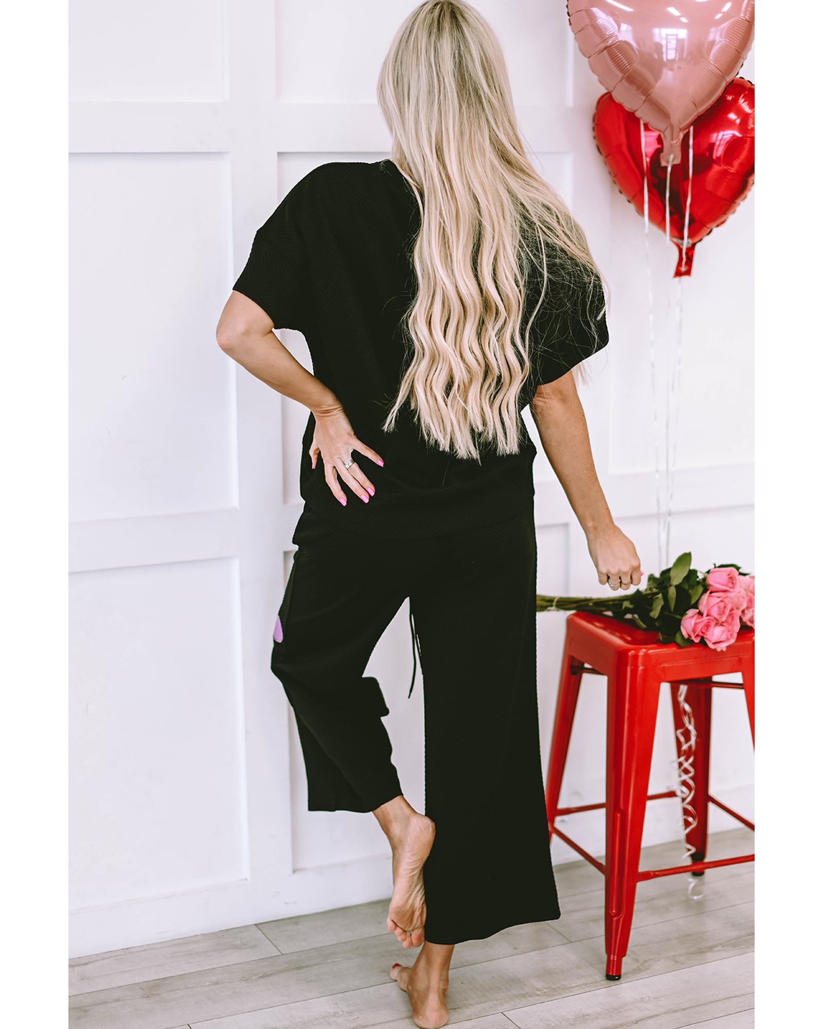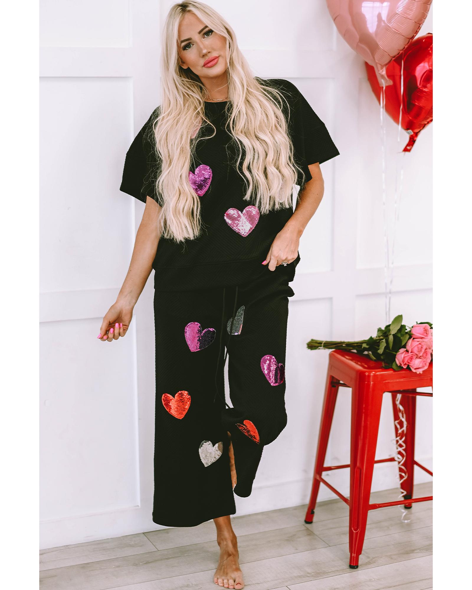 Black Sequin Heart Popping Graphic Textured 2pcs Outfit – L