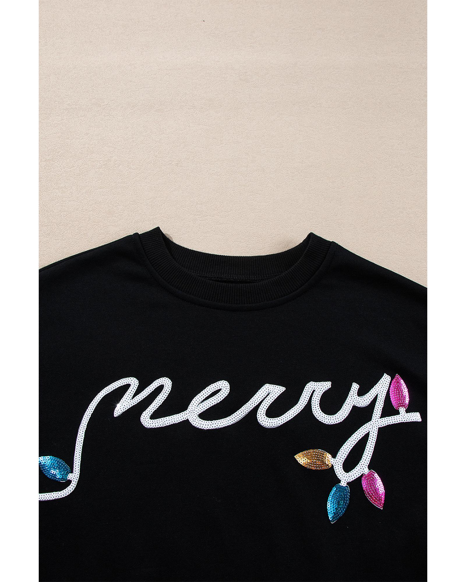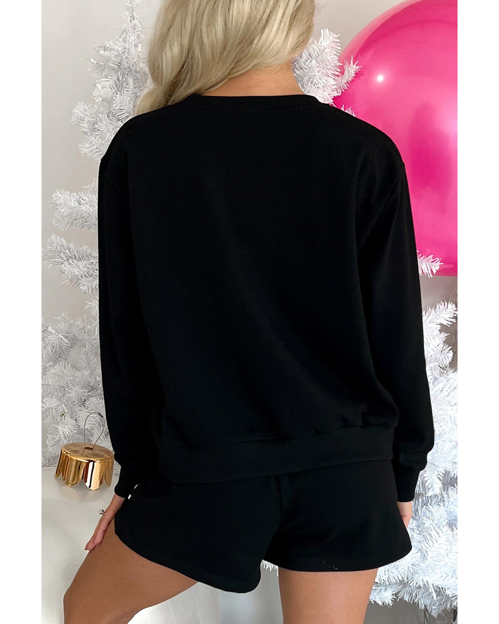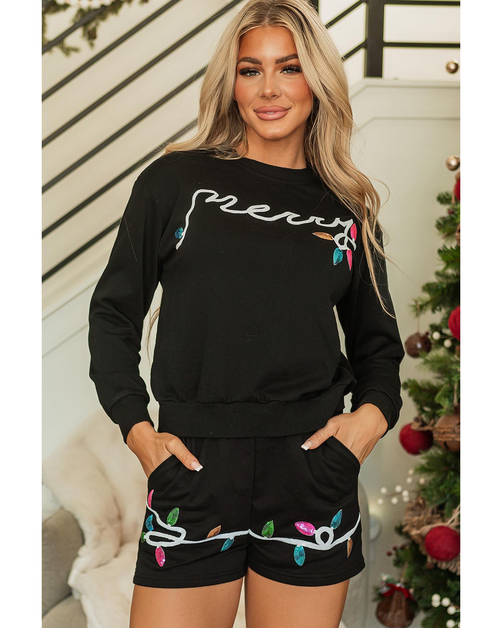 Black Sequin Merry Graphic Pullover and Shorts Outfit – L