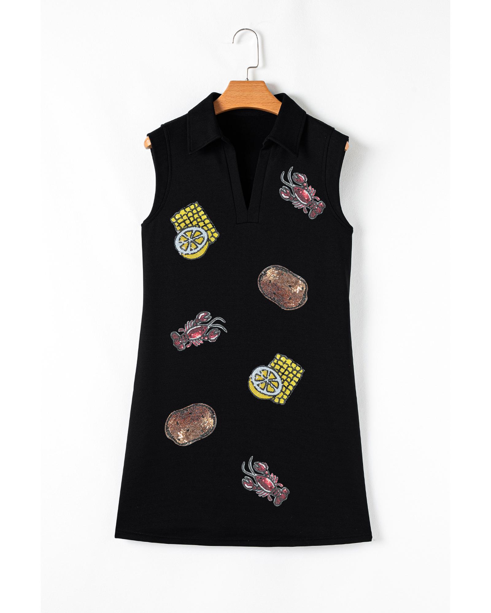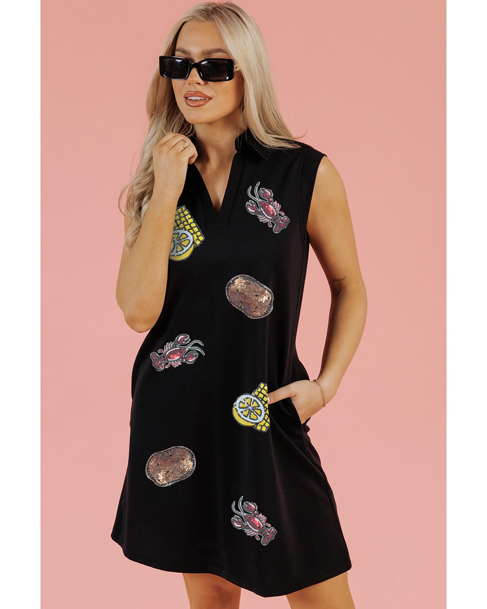 Black Sequin Patched V Neck Collared Mini Dress – XL