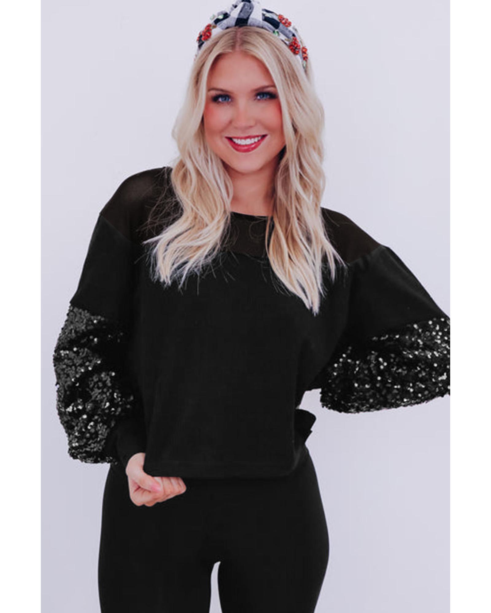 Black Sequin Patchwork Lantern Sleeve Blouse – L