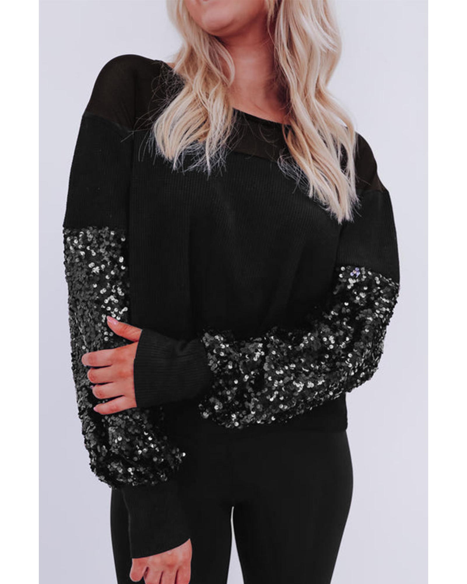 This stylish blouse features a black sequin patchwork design with lantern sleeves, offering a trendy and fitted look. Made from waffle knit fabric, it combines comfort with a fashionable appearance. The blouse is versatile and easy to match with various outfits, suitable for different occasions.