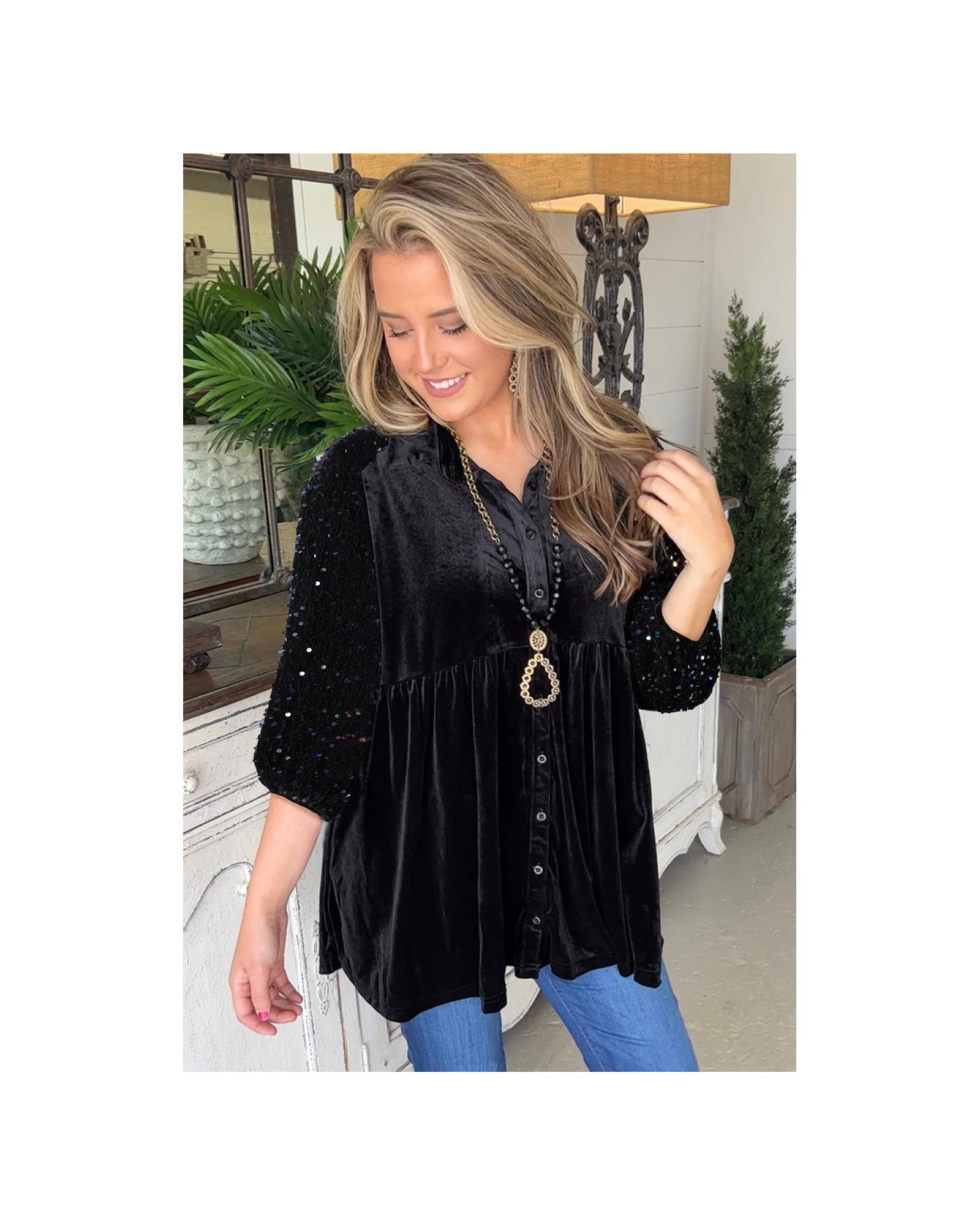 Black Sequin Puff Sleeve Buttoned Velvet Peplum Shirt – XL