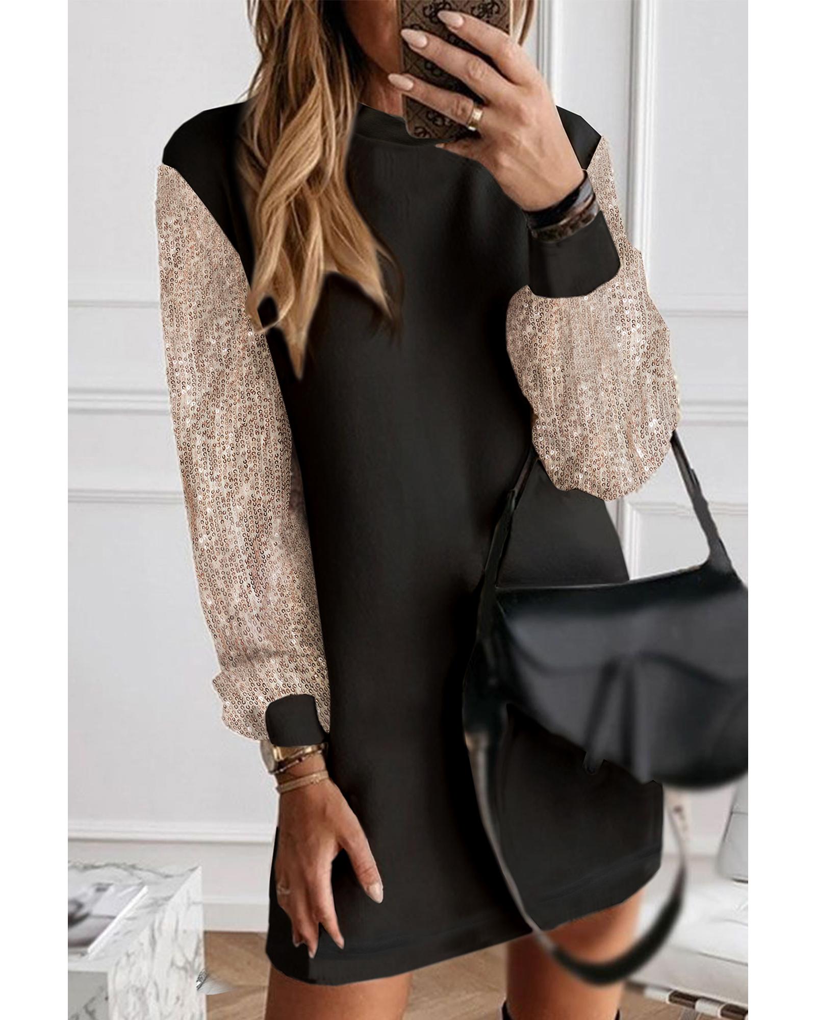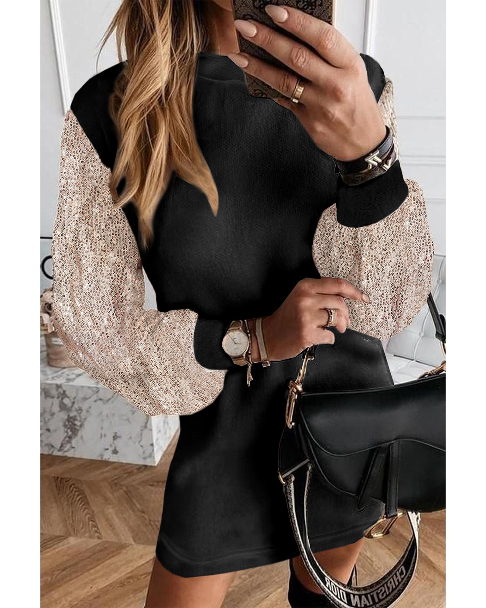 This stylish mini dress features a sleek black sequin design with puff sleeves, creating a glamorous and feminine look. Its classic crew neck adds versatility, making it suitable for various occasions. The dress is made from a high-elasticity fabric blend, ensuring comfort and a fitted silhouette.