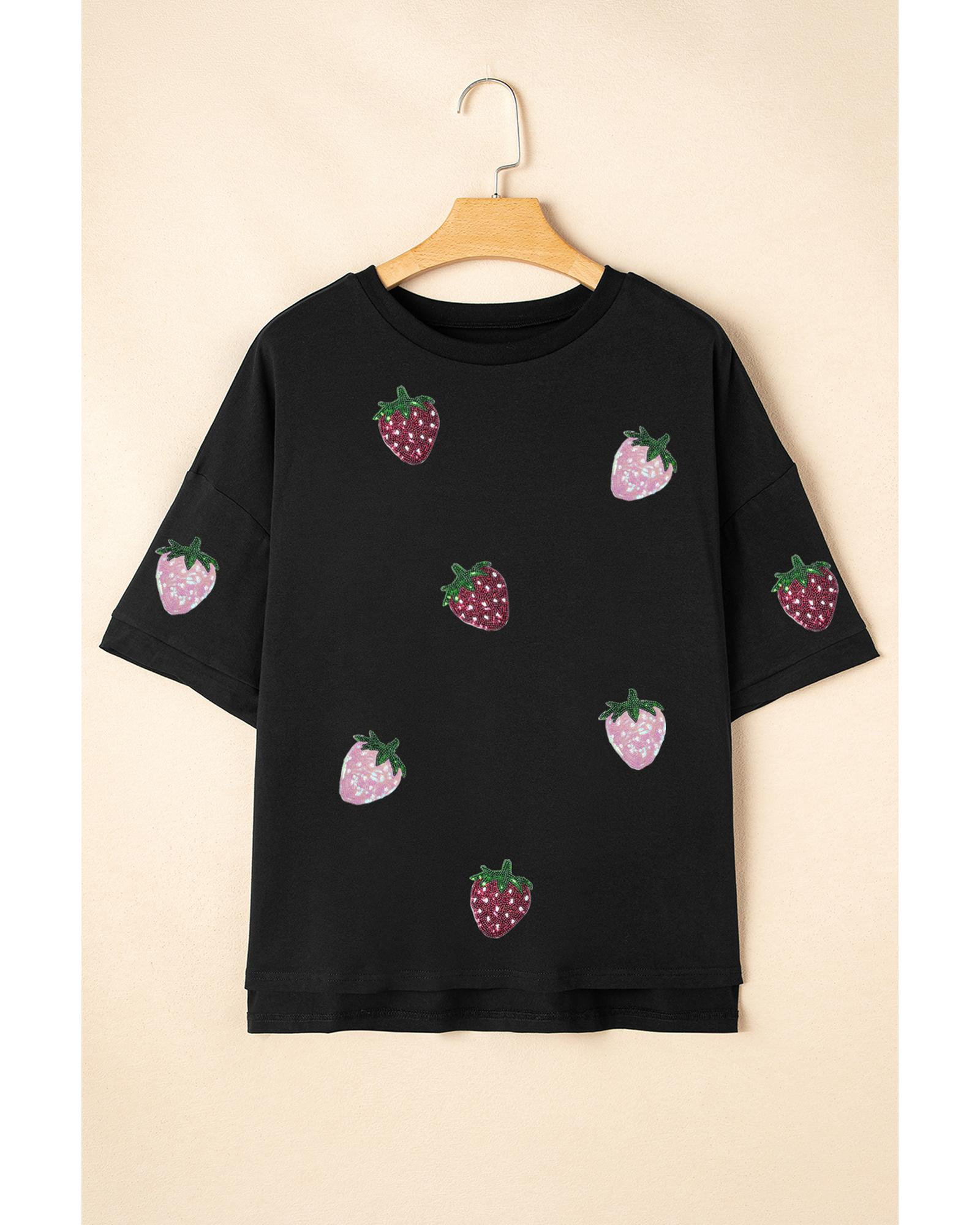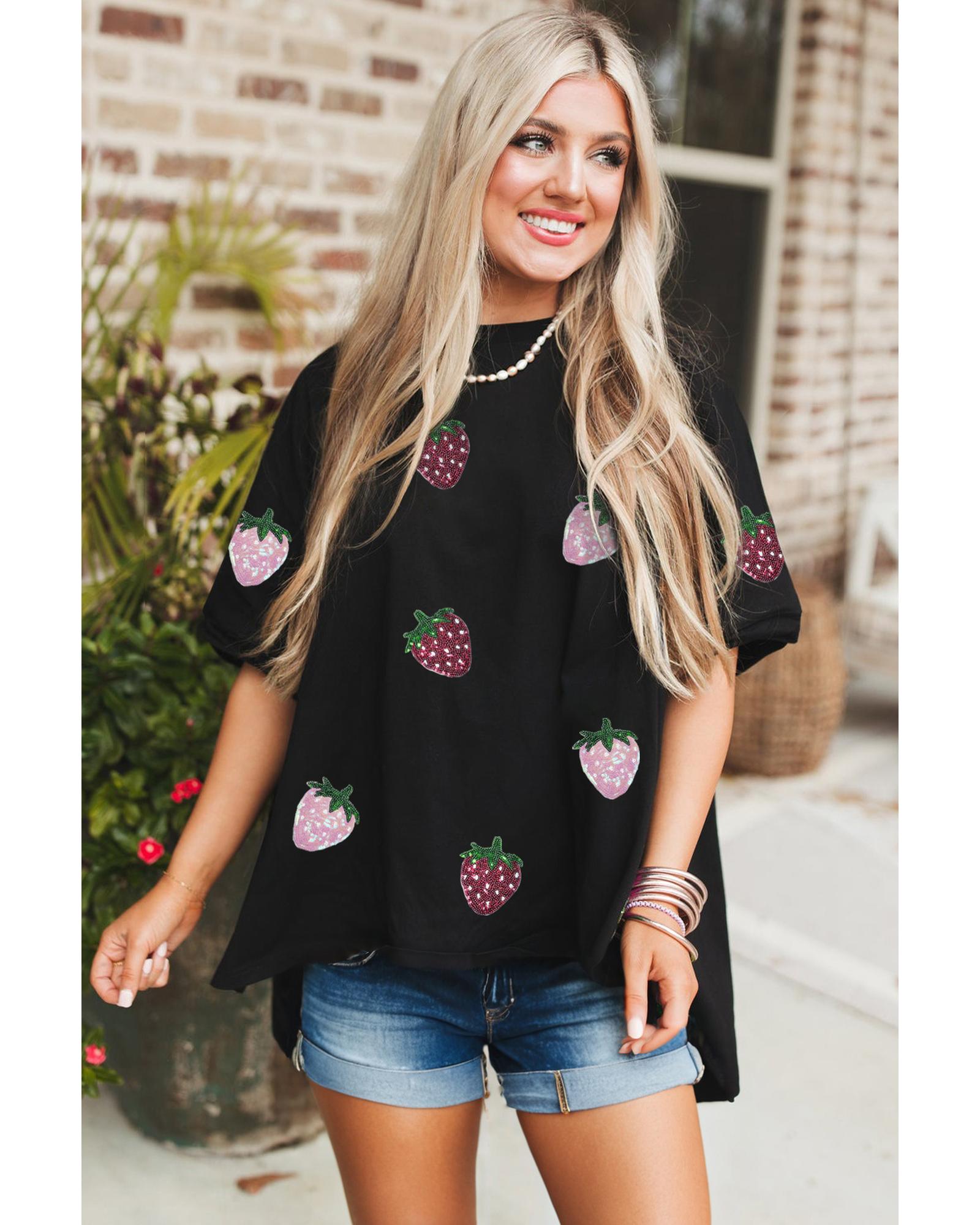 Package Content: One high-low relaxed fit tee with sequin strawberry graphic.