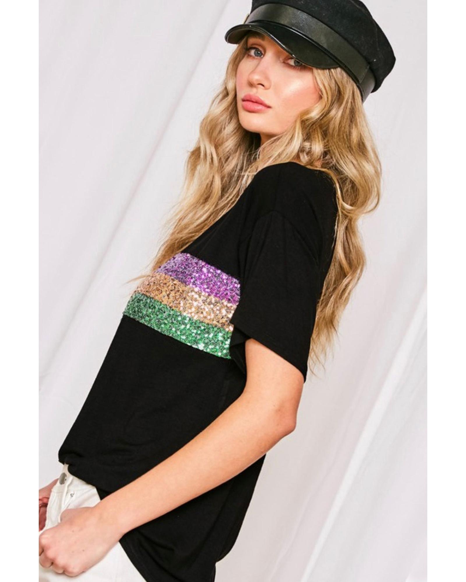 Black Sequin Stripes Patchwork Mardi Gras Crew Neck T Shirt – M