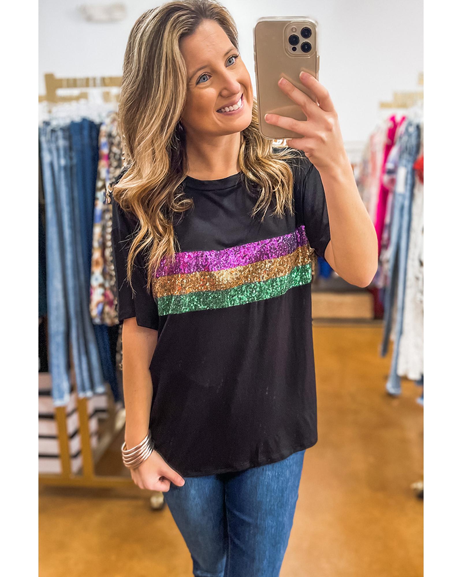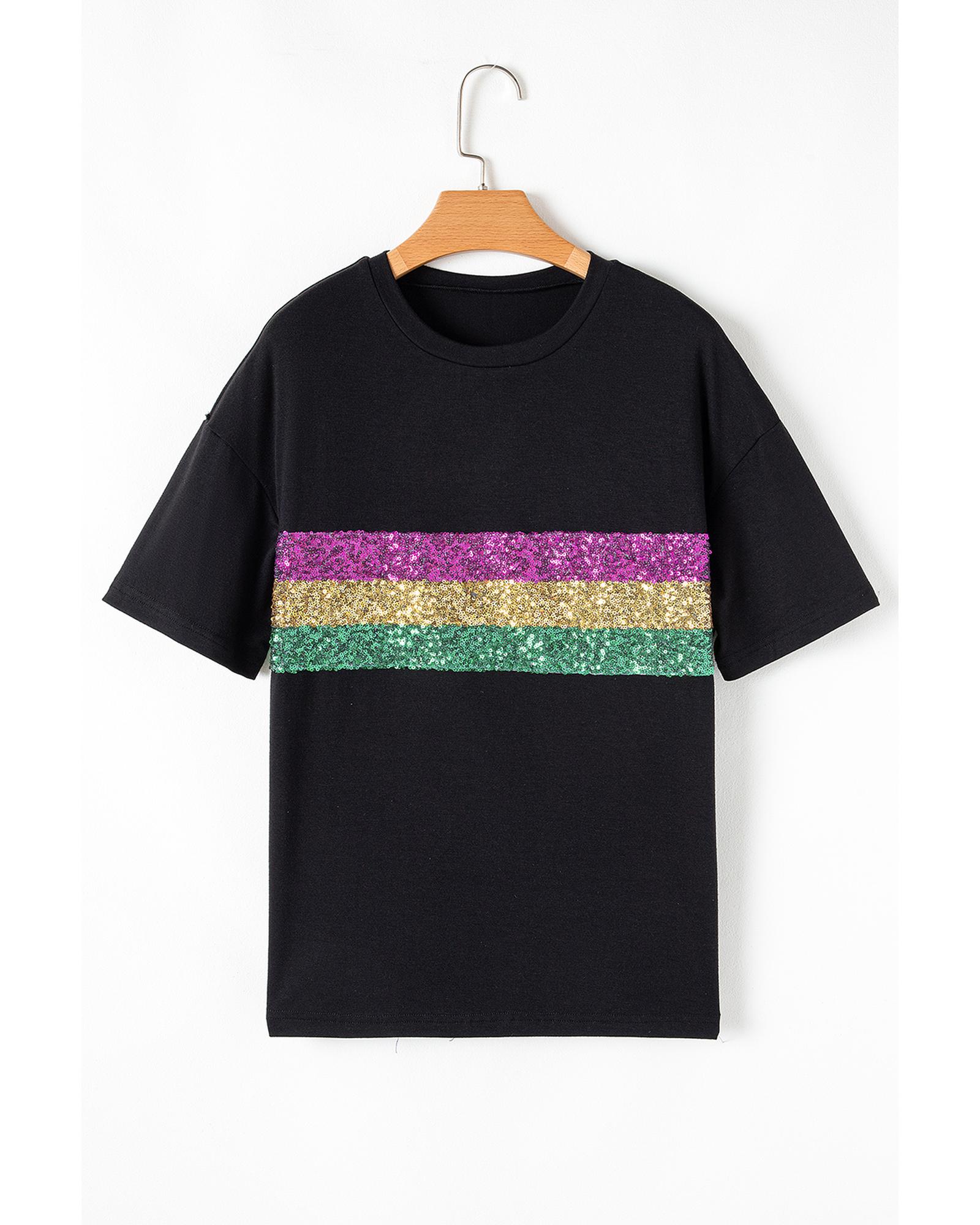 Black Sequin Stripes Patchwork Mardi Gras Crew Neck T Shirt – S