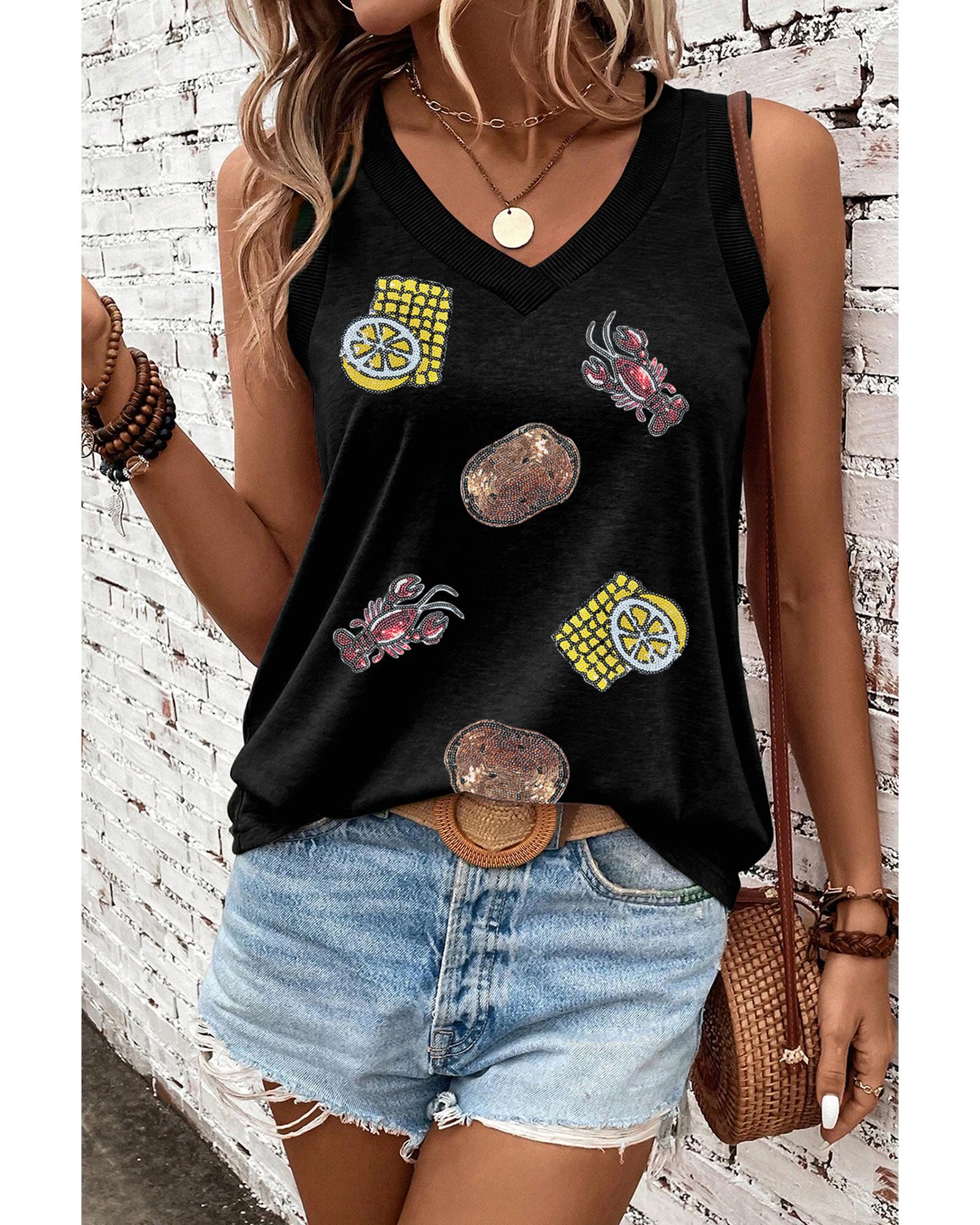 Black Sequined Crawfish Ribbed V Neckline Tank Top – M