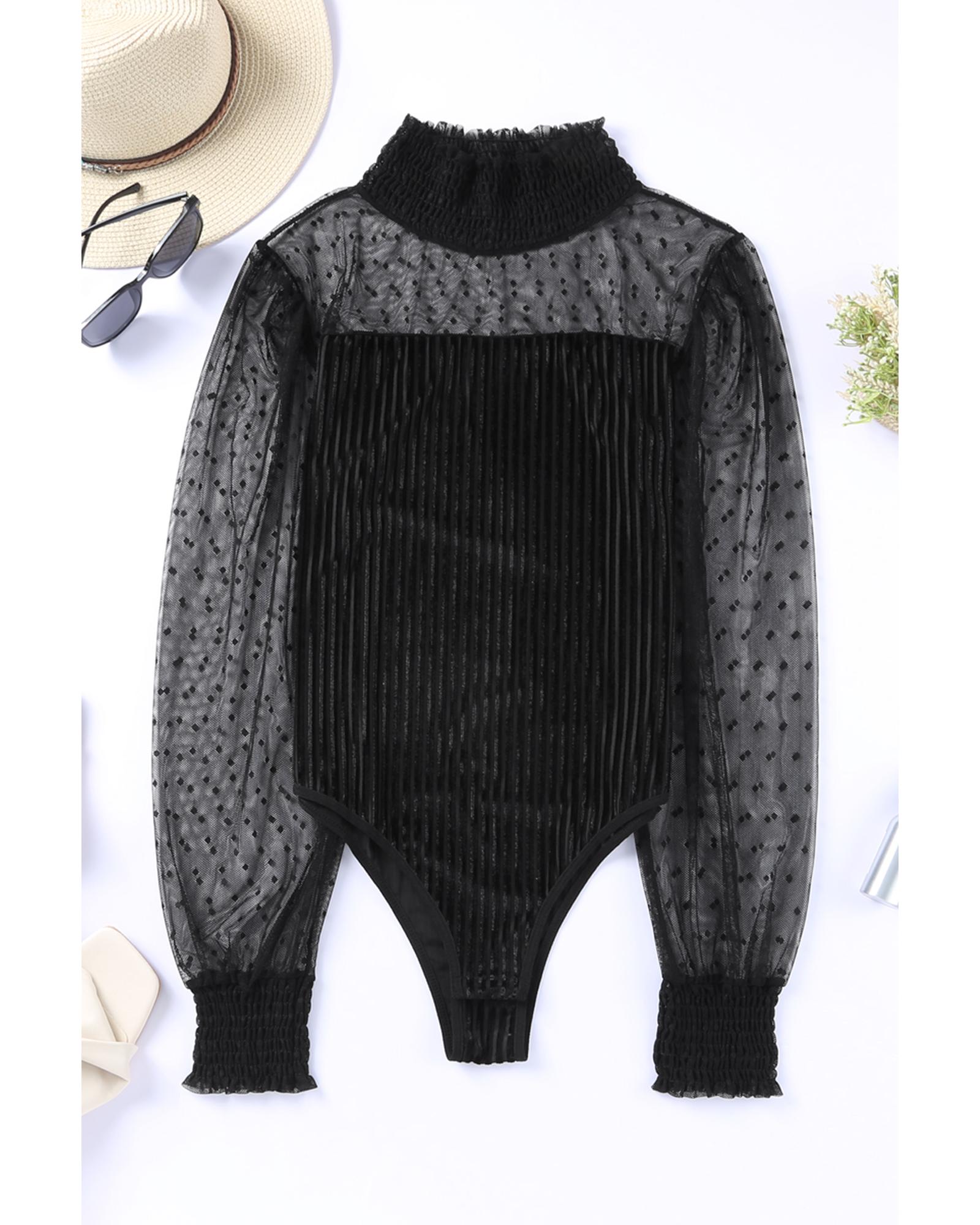 This long sleeve bodysuit features a sheer dotty design combined with ribbed velvet fabric, creating an elegant and trendy look. Its fitted style is suitable for various occasions such as daily wear, dates, parties, clubs, and trips, offering both comfort and chic appeal.