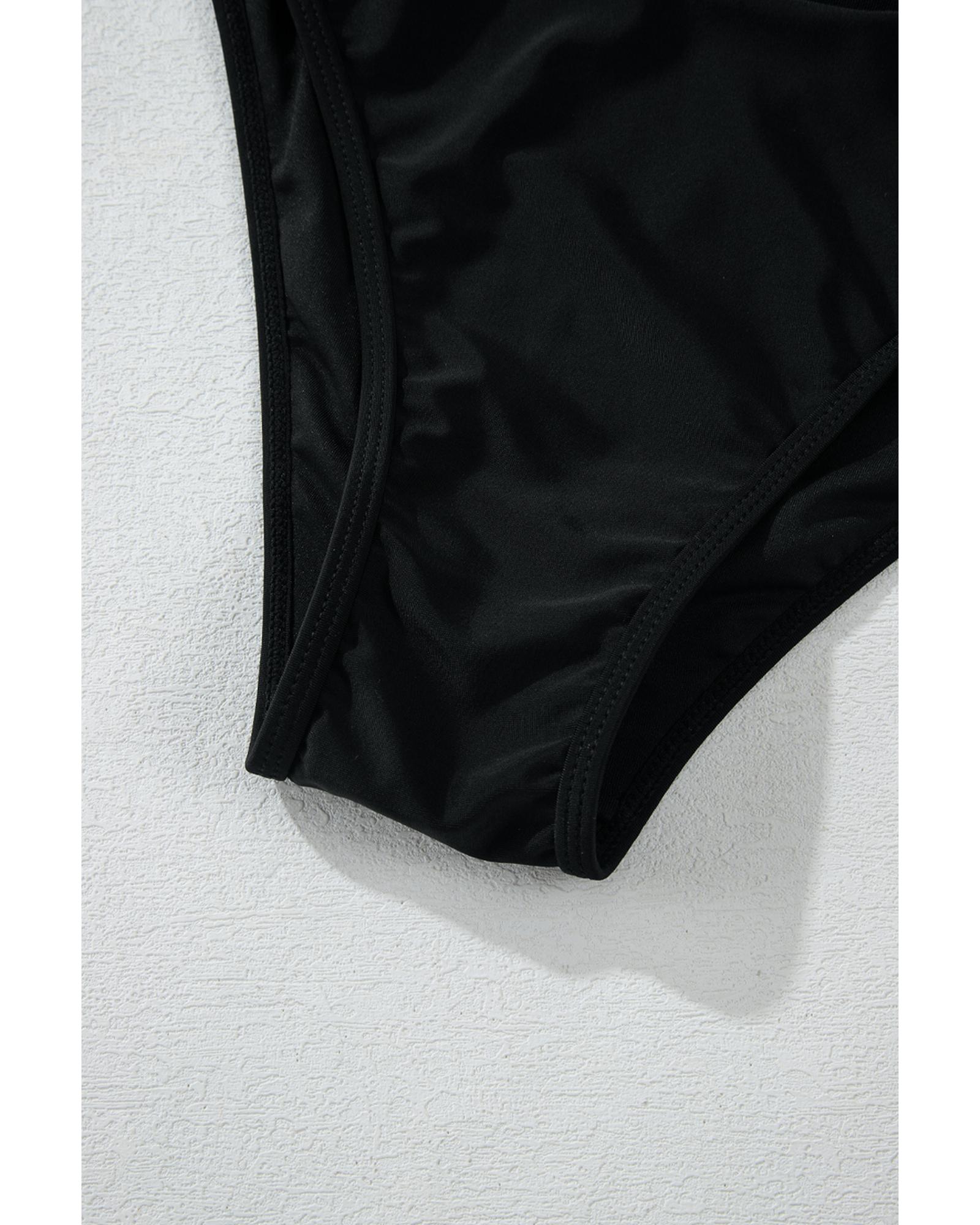 This black sheer mesh edged halter V neck push-up bikini combines a trendy fitted design with elegant details. Its classic halter neckline and sheer mesh accents create a sophisticated look, while the push-up style enhances and supports the bustline for a flattering silhouette.