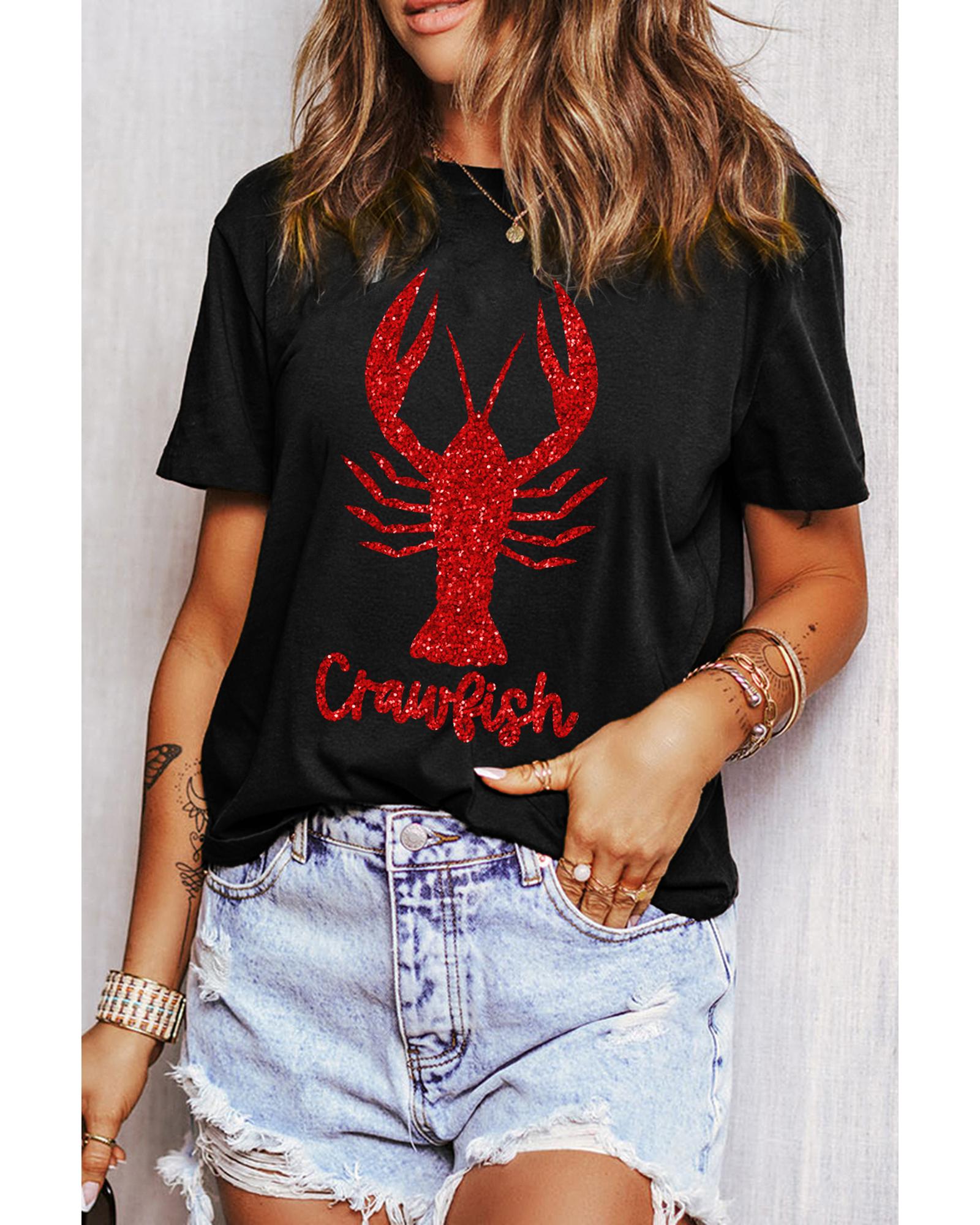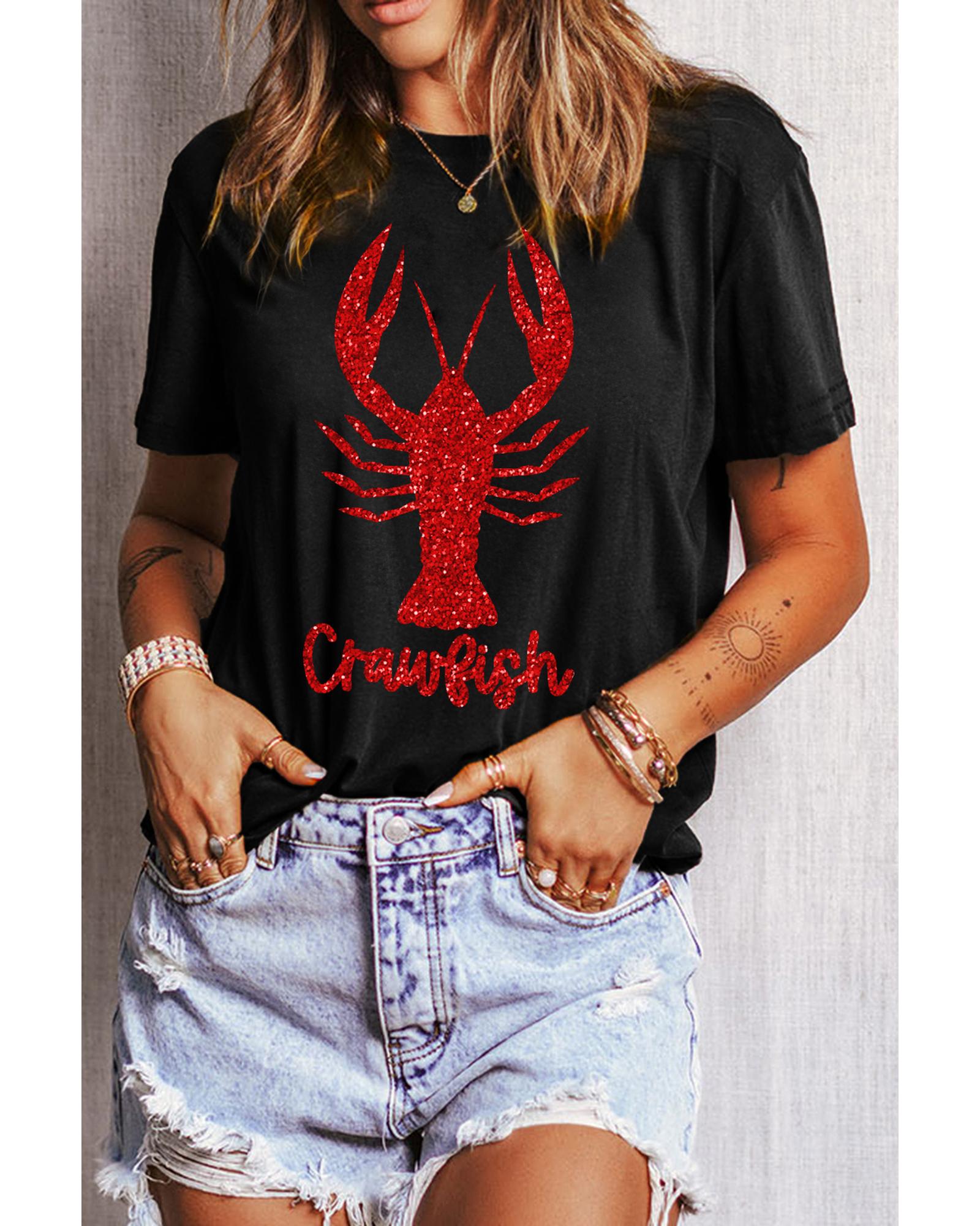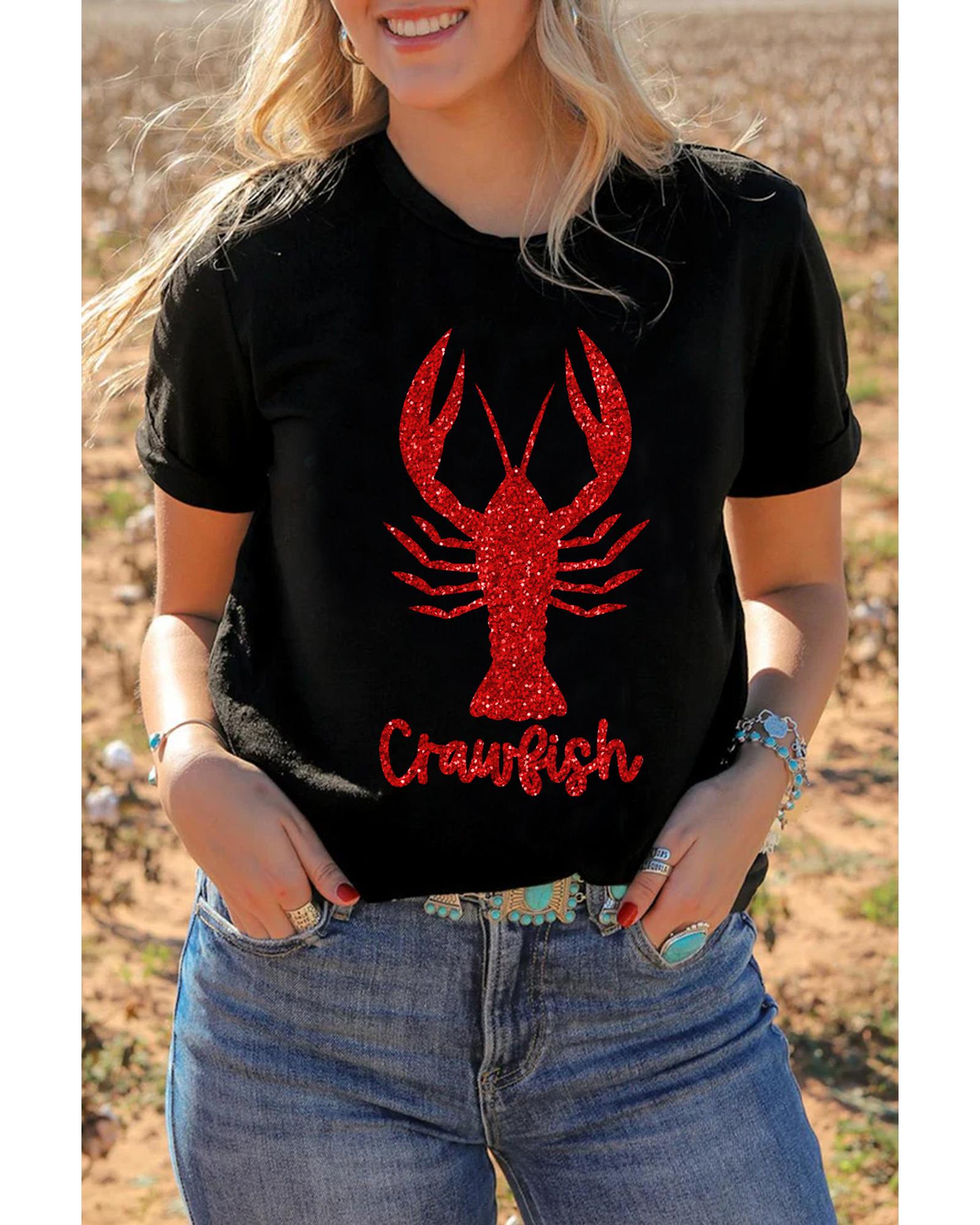 This graphic tee features a playful crawfish design with a shimmering finish, making it a fun addition to casual outfits. Crafted from a comfortable blend of polyester and cotton, it offers a breathable fit suitable for everyday wear. The round neck and relaxed silhouette ensure ease of movement and all-day comfort. Easy to care for, this shirt is machine washable and ideal for casual occasions.