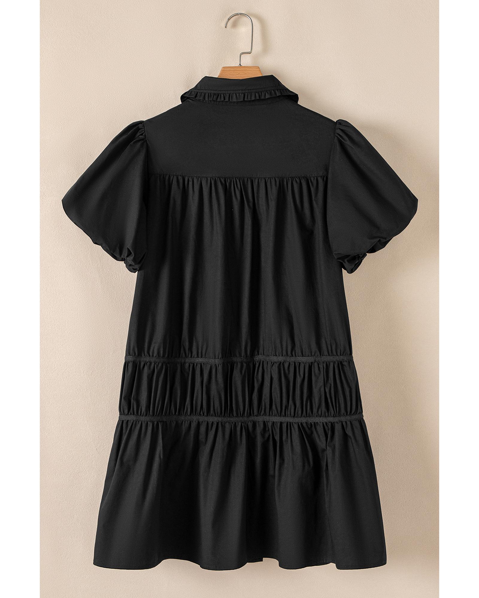 Black Shirt Style Button Down Puff Sleeve Ruffle Hem Dress – S