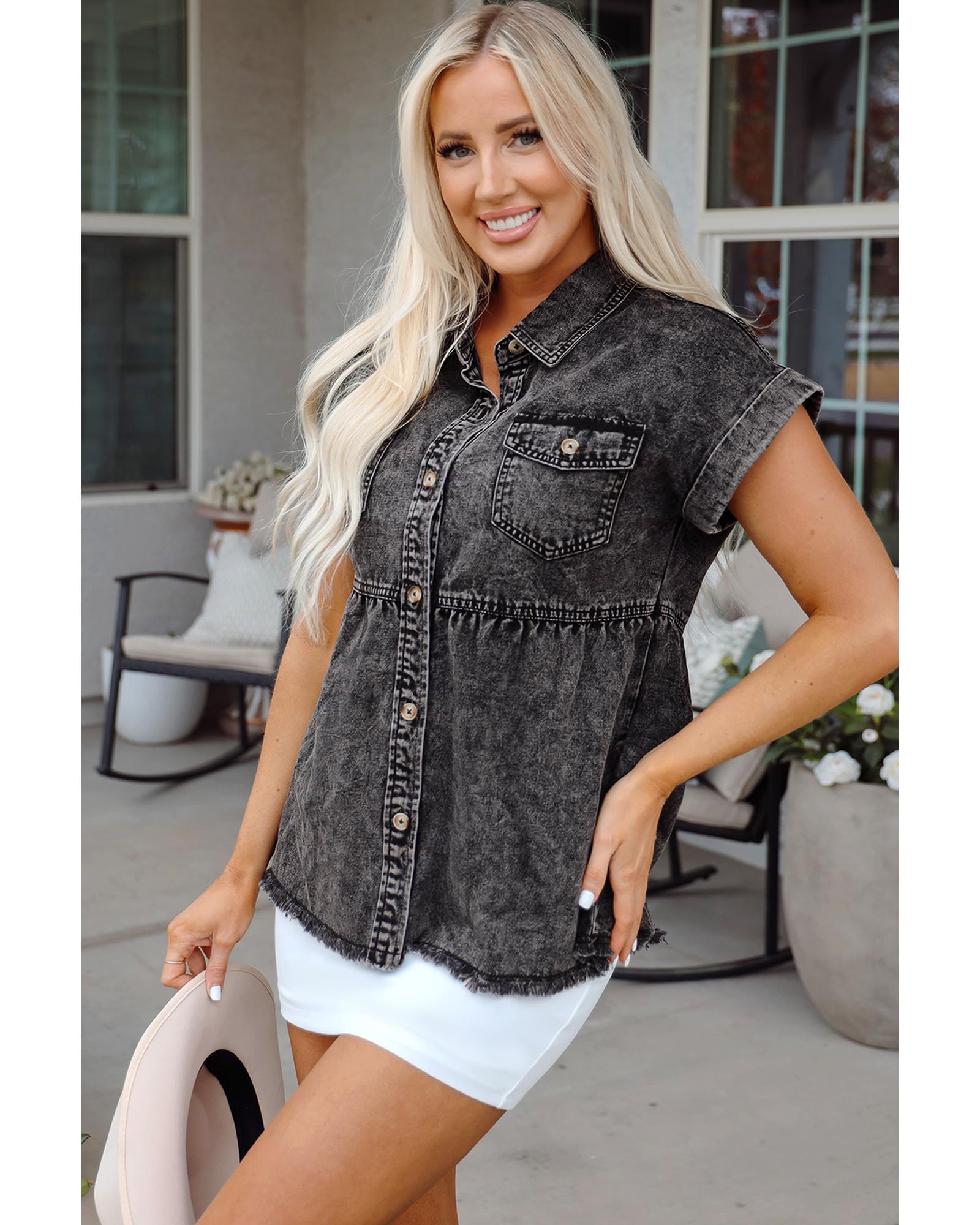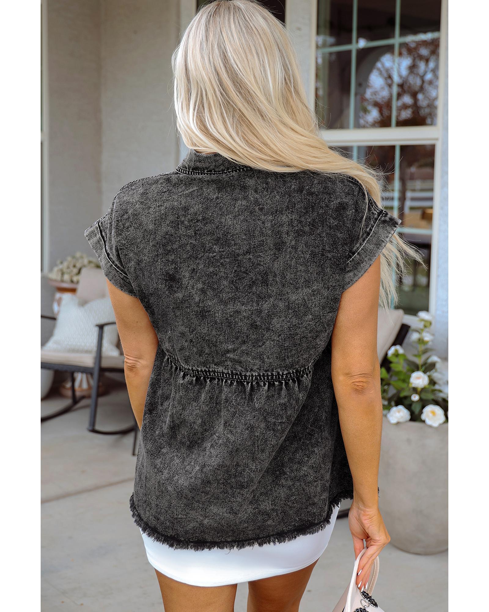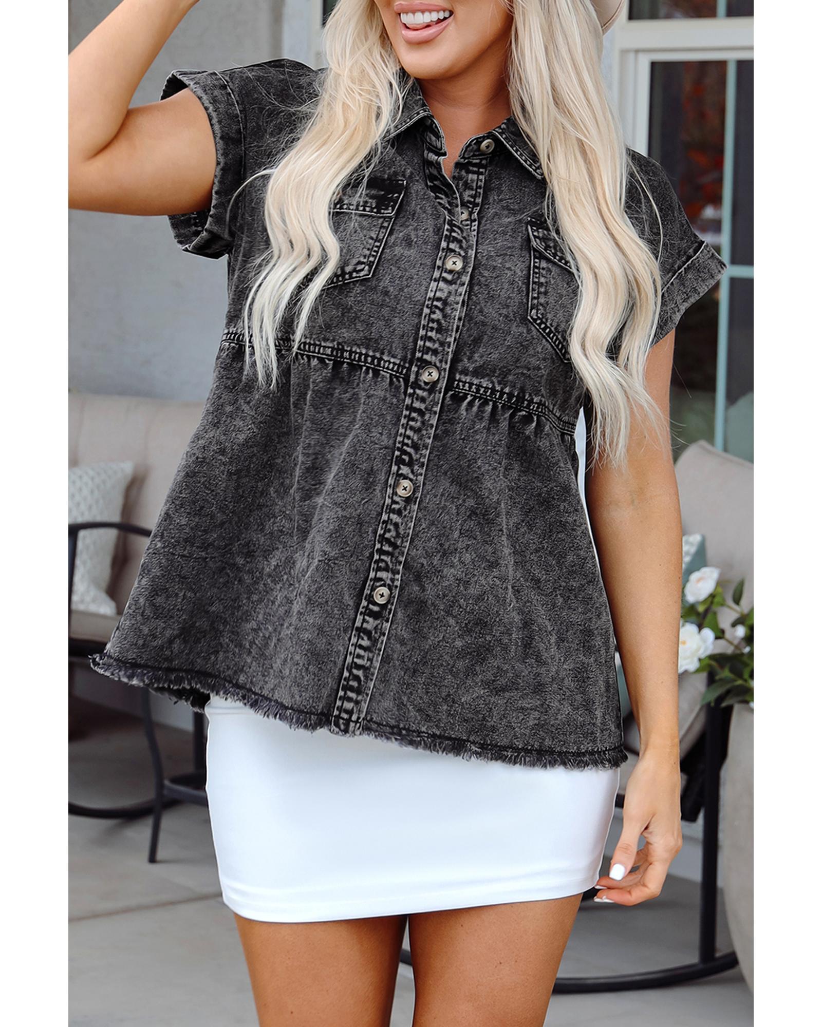 Black Short Sleeve Flap Pocket Button Up Raw Hem Denim Shirt – L